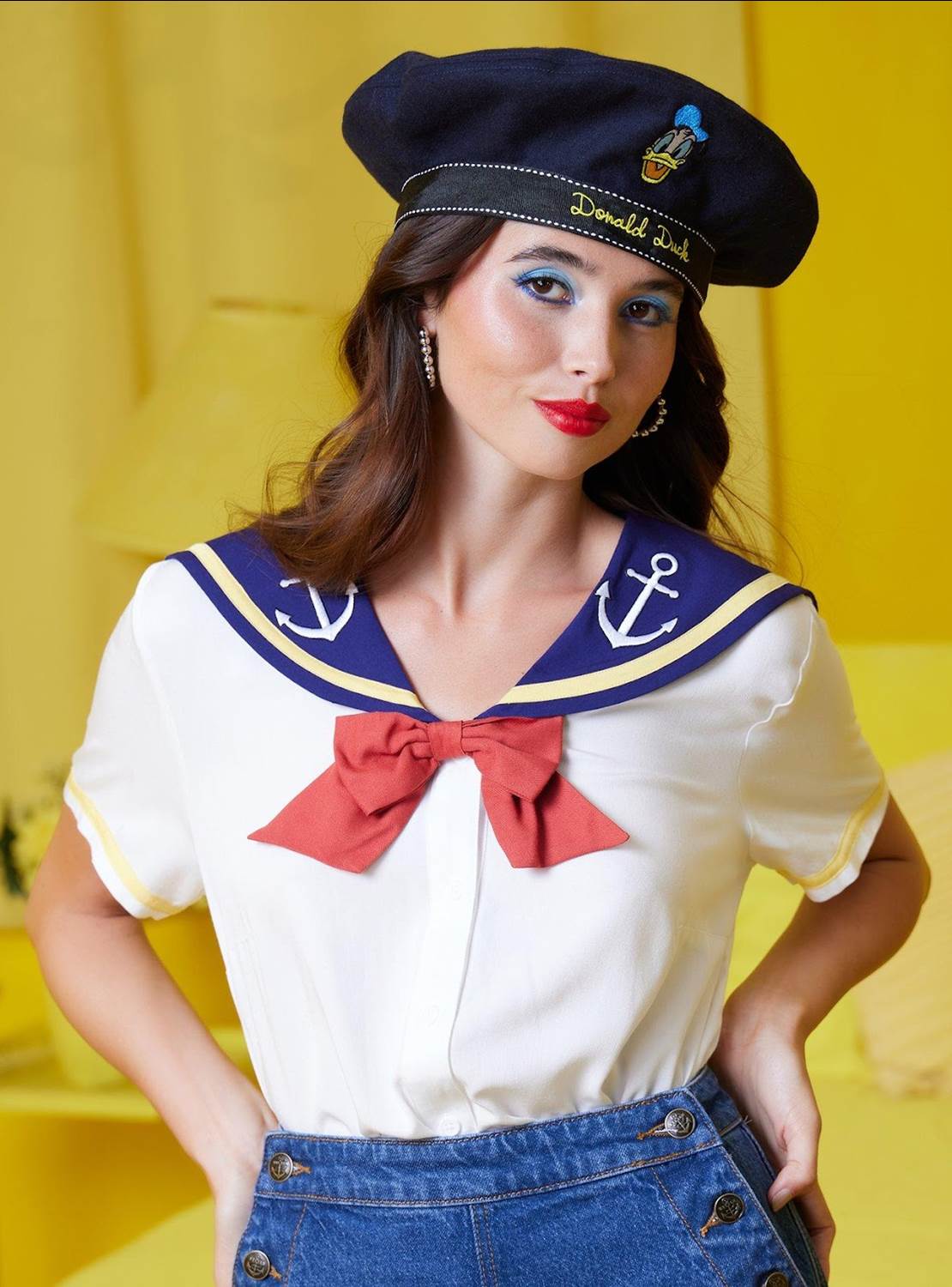Embracing Donald’s classic sailor look has never been so easy! Her Universe delivers a dressy top complete with large collar, and red tie that will have you running off for a seafaring voyage. Donald’s name and his face are embroidered along the back of the collar so you always know who inspired the look.