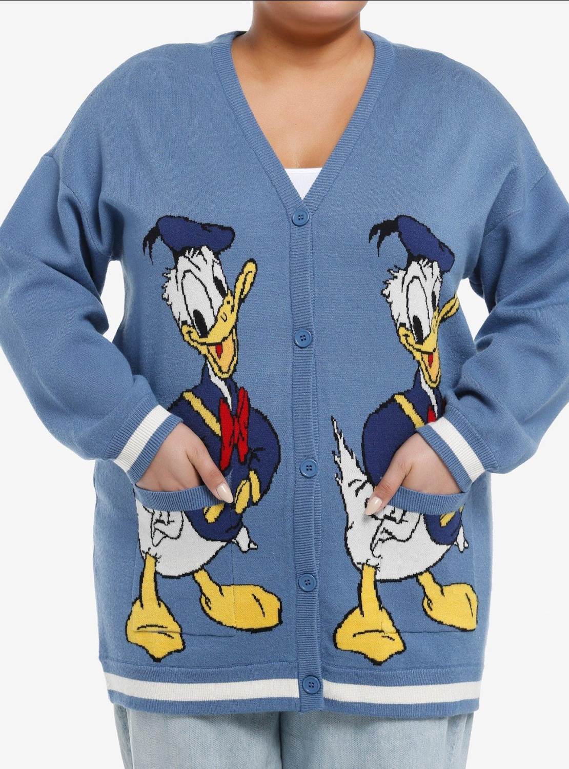 Is there a chill in the air? When the sun goes down, the temperature can shift so stay perfectly cozy in this all blue cardigan featuring our feathered friend. Donald takes over the entire back side in his classic pose, which is also presented on the front surrounding two small pockets.