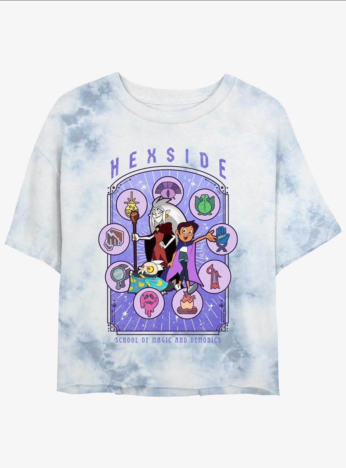 Yes, there’s a crop top in the mix too! Embrace your life as a Hexside student with this Coven Celestial tee that features Luz and her pals surrounded by spell-like symbols.