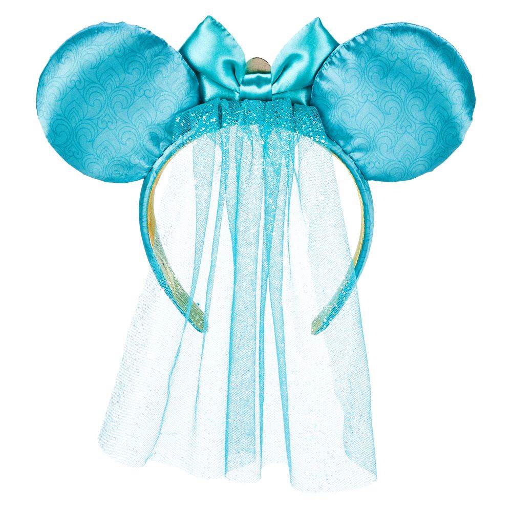 - Jasmine’s headband is presented in satiny aqua decorated with a light filigree and gold foil accents on the ears. A matching bow with a large aquamarine gemstone sits in the center of the headband and calls back to the jeweled headpiece she wears in the movie.