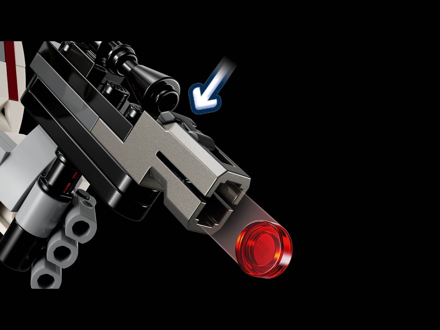 The larger-scale blaster can fire 1x1 transparent-red tiles by pressing down on the activator. This is a fun play feature included with many Star Wars LEGO building sets in recent years. The Luke minifigure can also wield his own smaller-scale lightsaber and blaster, and these two weapons can be clipped into the mech for safe-keeping while Luke is in the pilot seat.