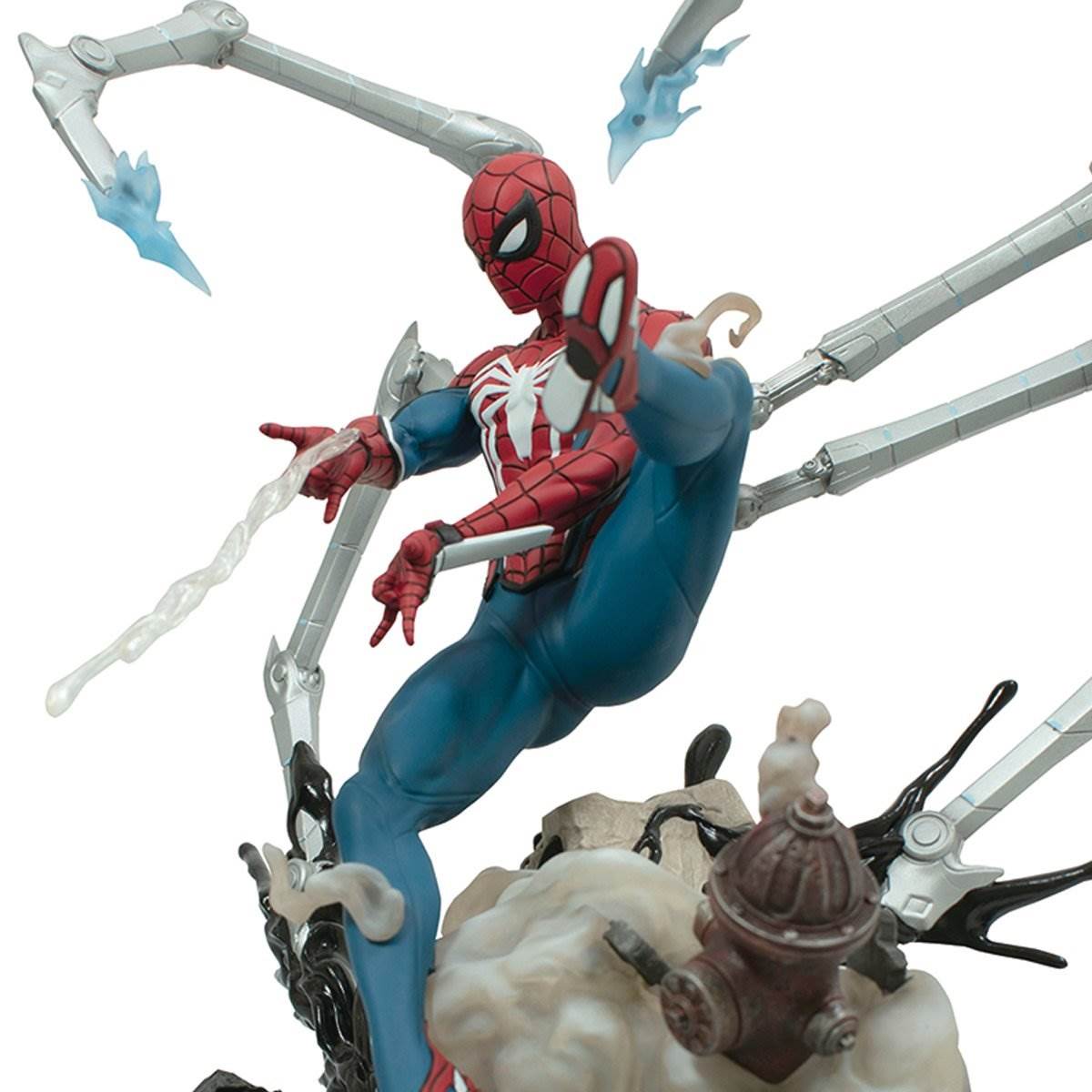 “Game on! Based on the hit Spider-Man 2 video game, this Spider-Man statue is packed with action! His four mechanical arms are extended and firing a line of webbing! Pair with Miles Morales and Venom (sold separately)."