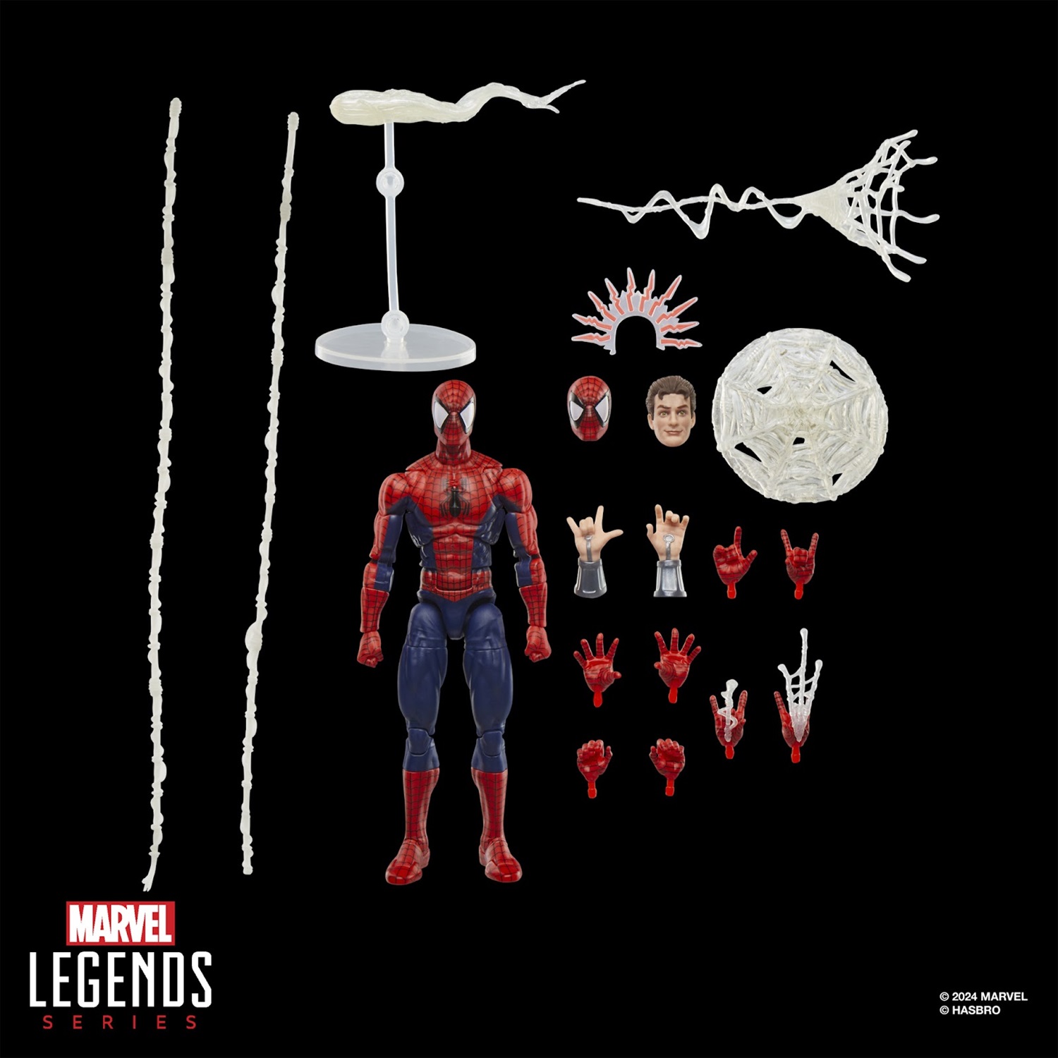 The full list of accessories includes an alternate unmasked Peter Parker head; alternate Spidey-sense head with removable tingle effect; 2 hands in THWIP pose; 2 hands launching webs; 2 wall-crawling hands; 2 hands with revealed web-shooters; 2 web-slinging hands that can grip the 2 web lines over 9 inches; backpack; web shield that can peg on the figure’s arm; plus web snare and web blast effect complete with a hinged web display stand.