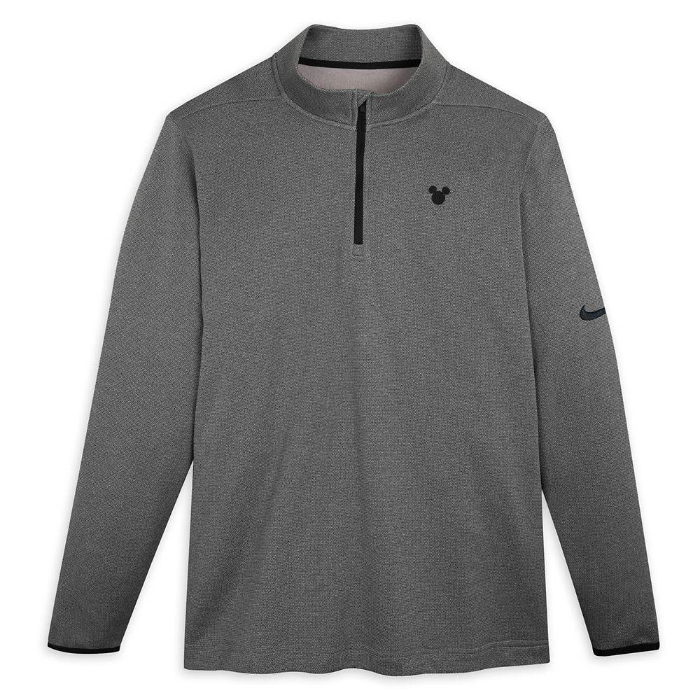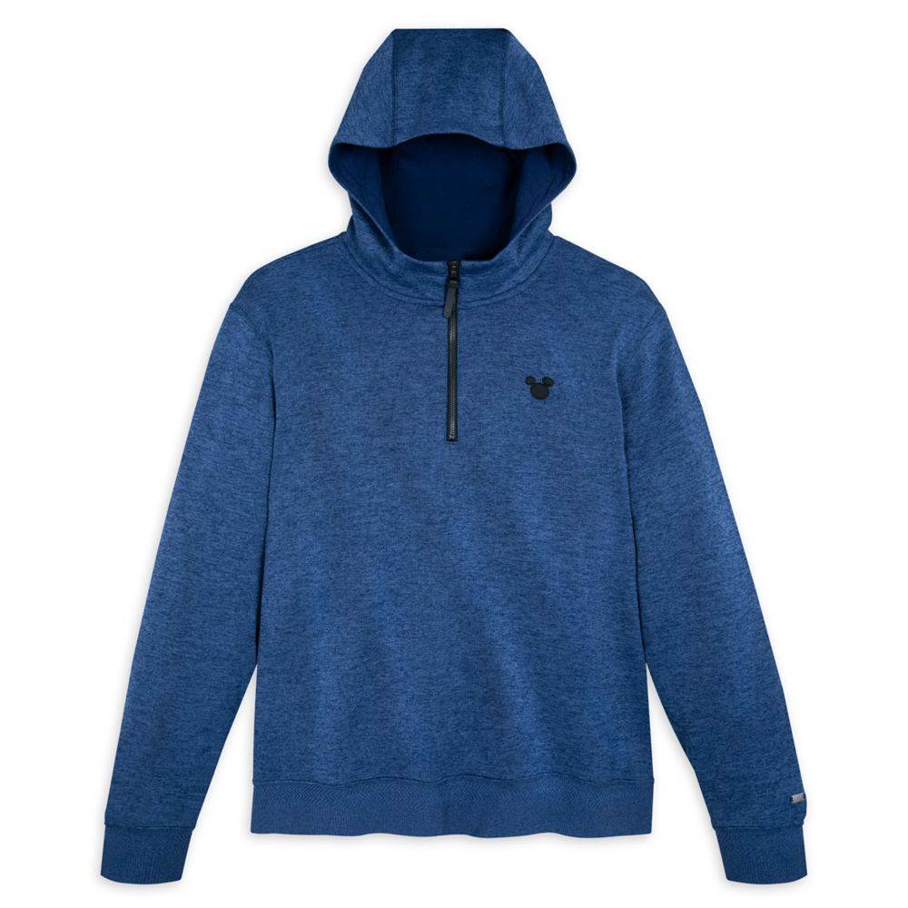 - The pullover is heathered blue-grey in color with a black zipper and a small embroidered Mickey Mouse on the left chest. It’s simple and not overstated making this an essential piece for your outdoor wardrobe.