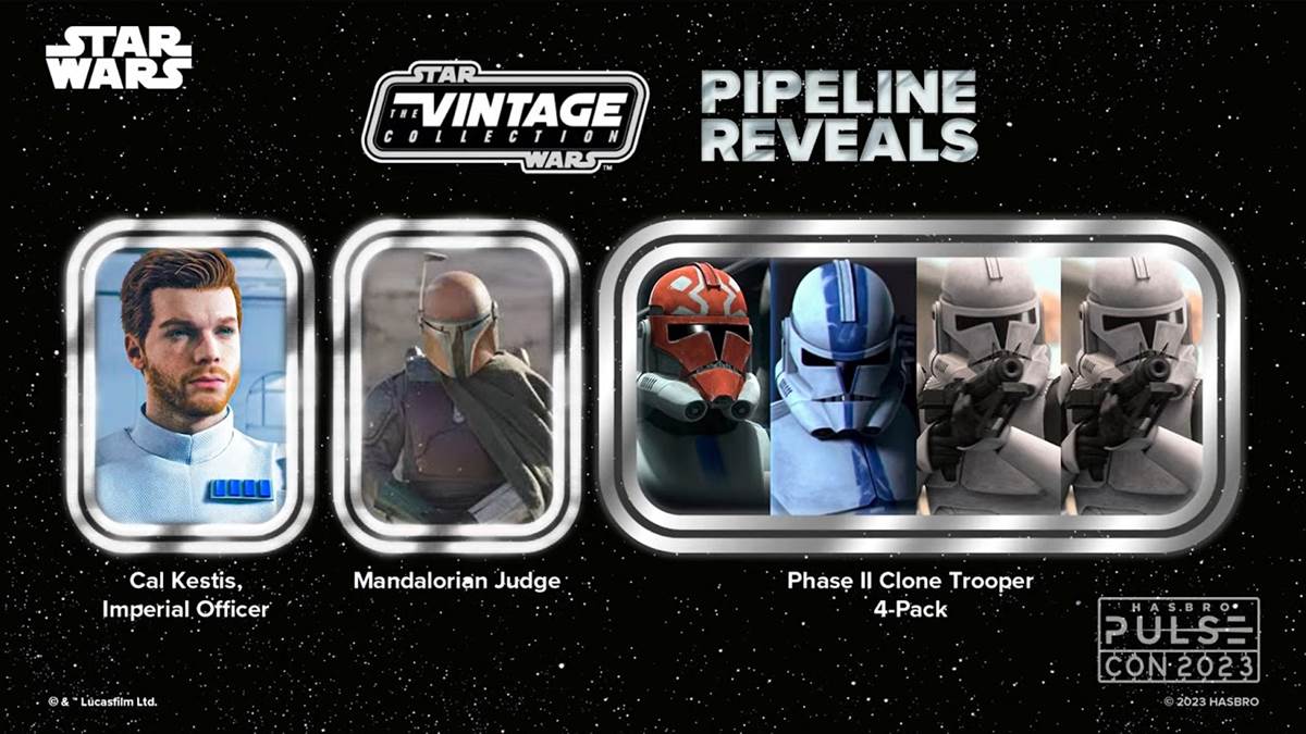 Lastly, the Hasbro Star Wars team announced some future action figures coming down the pipeline for both The Vintage Collection (Cal Kestis in his Imperial Officer disguise from Star Wars: Jedi - Survivor, the Mandalorian Judge from The Mandalorian, and a Phase II Clone Trooper 4-pack from Star Wars: The Clone Wars) and The Black Series (Darth Vader from Star Wars: Episode IV - A New Hope, the Mandalorian from season 3 of that series, a Phase I Clone Trooper from Star Wars: Episode II - Attack of the Clones, and a Mandalorian Nite Owl).