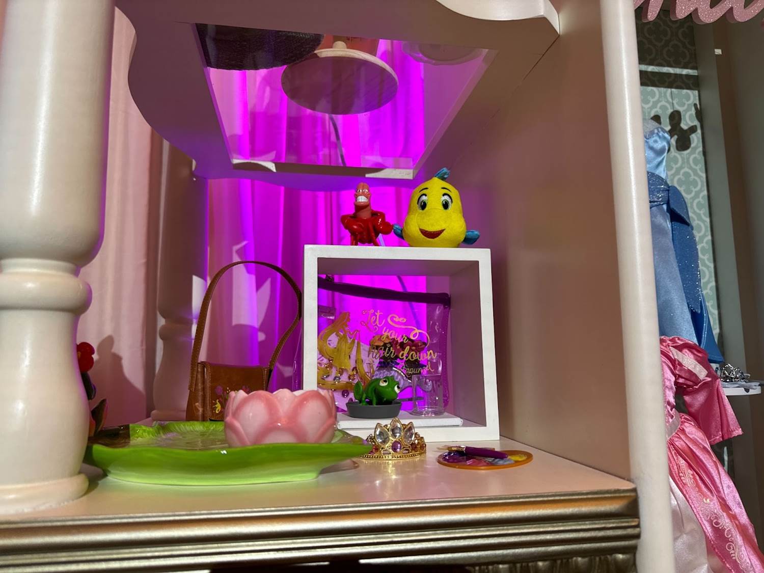 Aurora (aka Sleeping Beauty) has claimed the master bedroom suite, while Cinderella’s mice will help anyone get ready in the vanity. The bathroom is fit for a mermaid, complete with a water slide down to the shell-shaped swimming pool.
