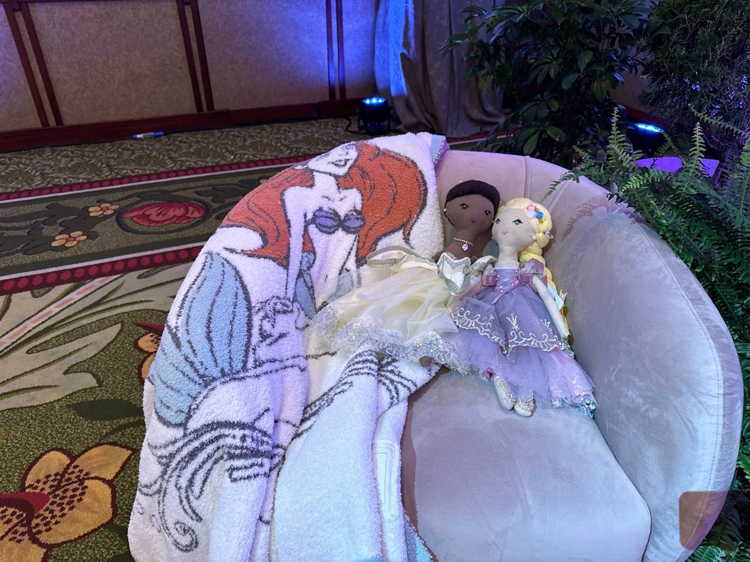 Pottery Barn Kids makes new Disney Princess soft dolls, with Tiana and Rapunzel on display at the event. Additional characters include Belle, Cinderella, and two versions of Ariel (animated and live-action). Barefoot Dreams recently debuted three new CozyChic blanket designs. The Ariel design was on display, with Snow White and Cinderella also available.