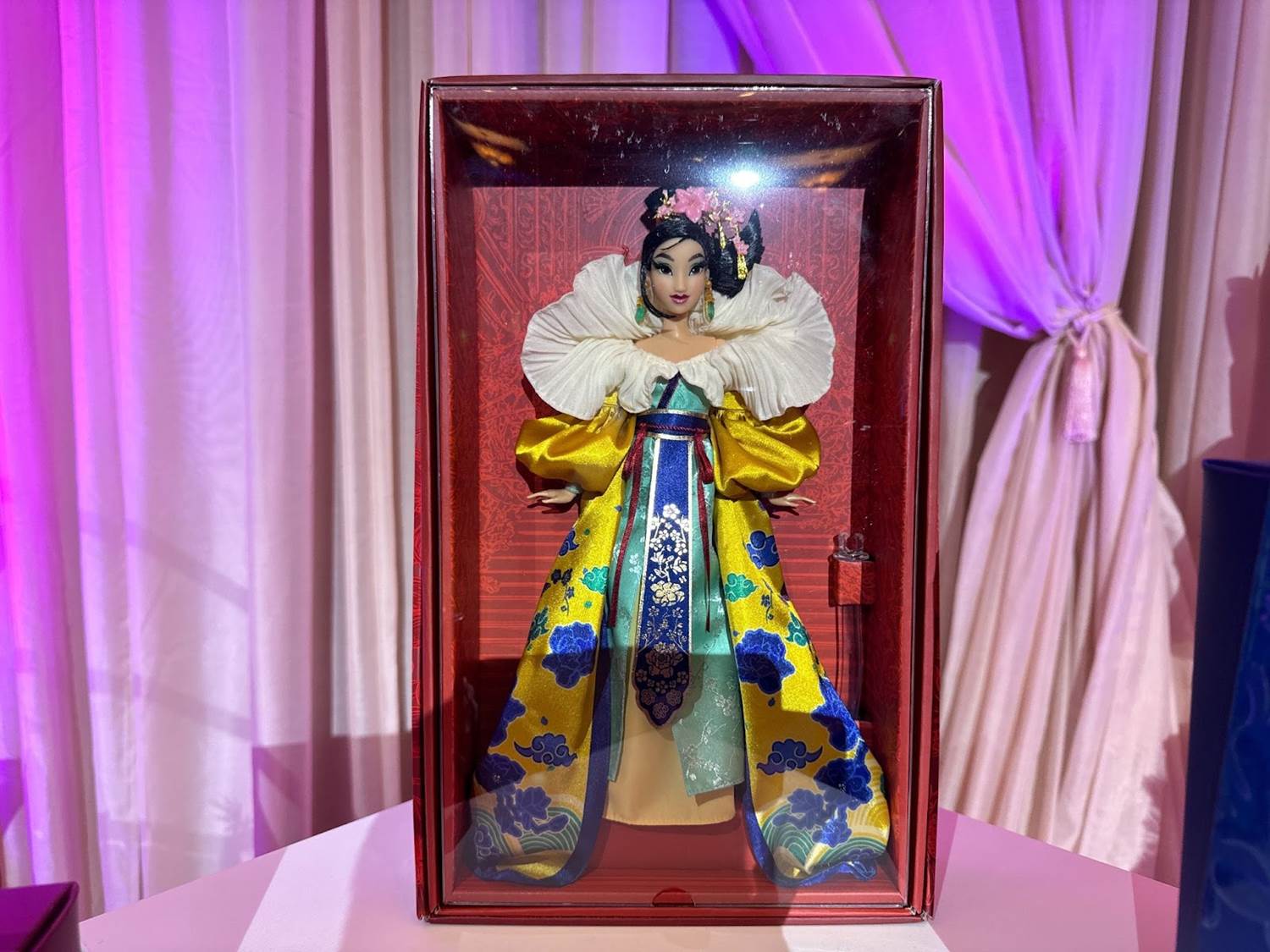 Mulan is fashioned in a satin jacquard robe with a blossom pattern, a theme that extends to her hair accessory. But the real scene stealer of this doll is her charmeuse cape