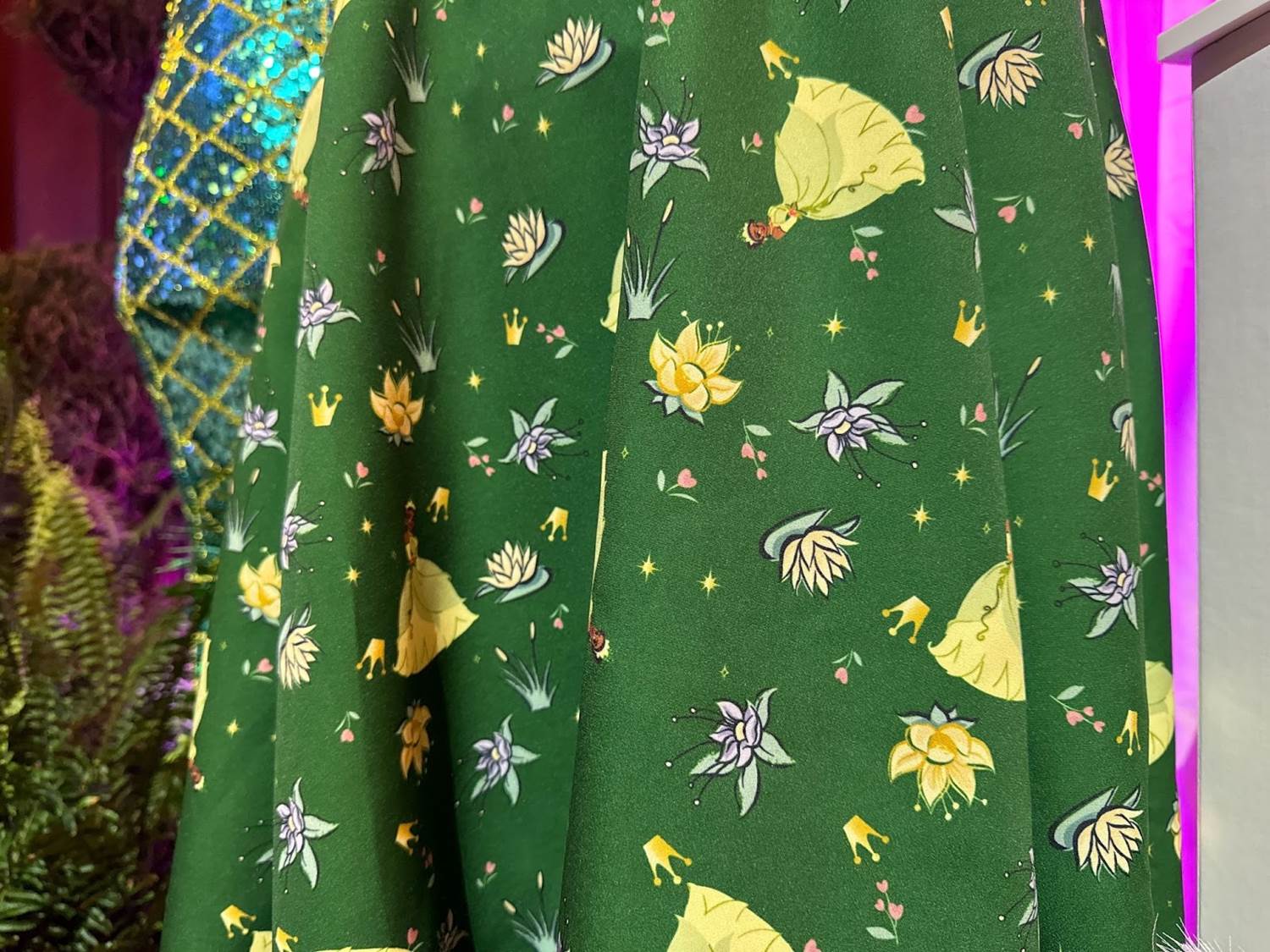 The Tiana dress is inspired by 1920s fashion, the era in which The Princess and the Frog is set. The green dress’ all over print features magnolia blossoms and lily pads, in addition to artwork of Princess Tiana herself. Available in sizes XS-XL and 1X-5X.