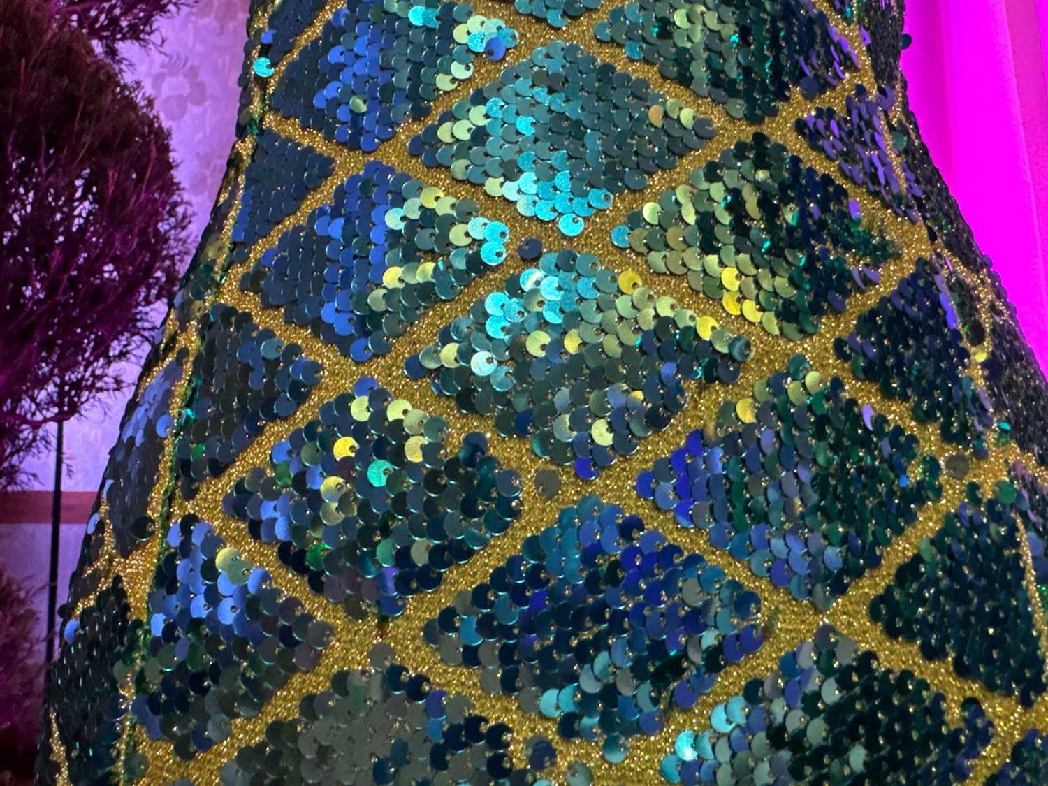 Ariel’s green fin and purple seashells have been reinterpreted in this mermaid gown with a taffeta pleated skirt to represent her fins. The bodice is made of purple organza, evoking the spirit of her iconic shells.