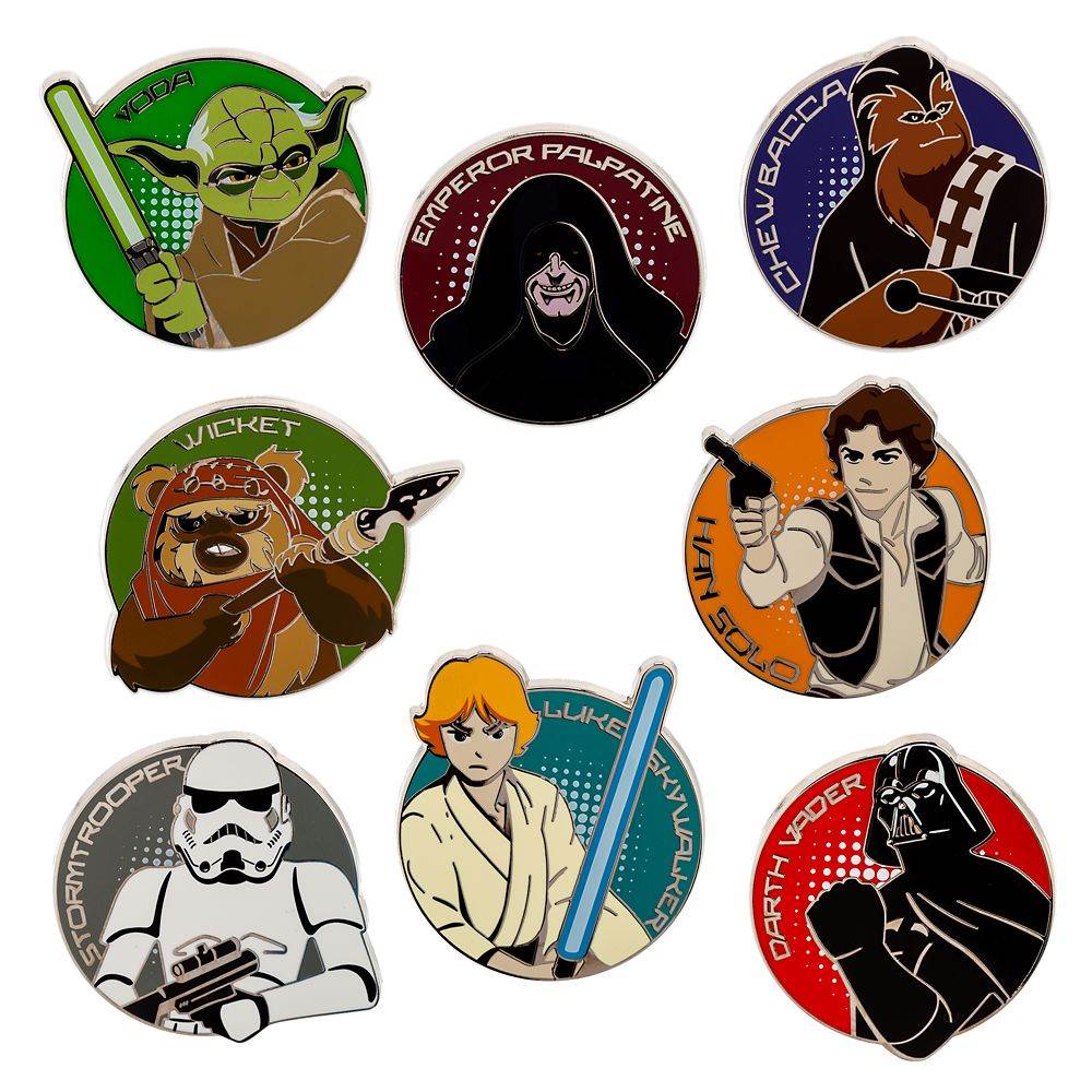 - Each box contains two randomly selected pins from eight overall designs. Series includes Luke Skywalker, Darth Vader, Yoda, Han Solo, Chewbacca, Wicket, Emperor Palpatine, and a Stormtrooper in anime styling