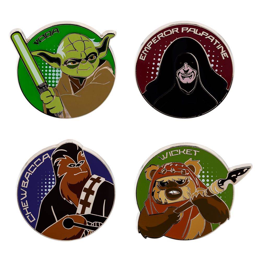 - Each box contains two randomly selected pins from eight overall designs. Series includes Luke Skywalker, Darth Vader, Yoda, Han Solo, Chewbacca, Wicket, Emperor Palpatine, and a Stormtrooper in anime styling