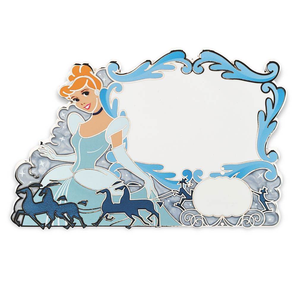 - Another great design is the Cinderella dry erase pin that you can actually write on! This jumbo collectible features the princess in her blue gown, silhouettes of her horse and carriage and space to decorate the pin.