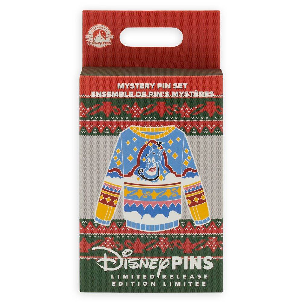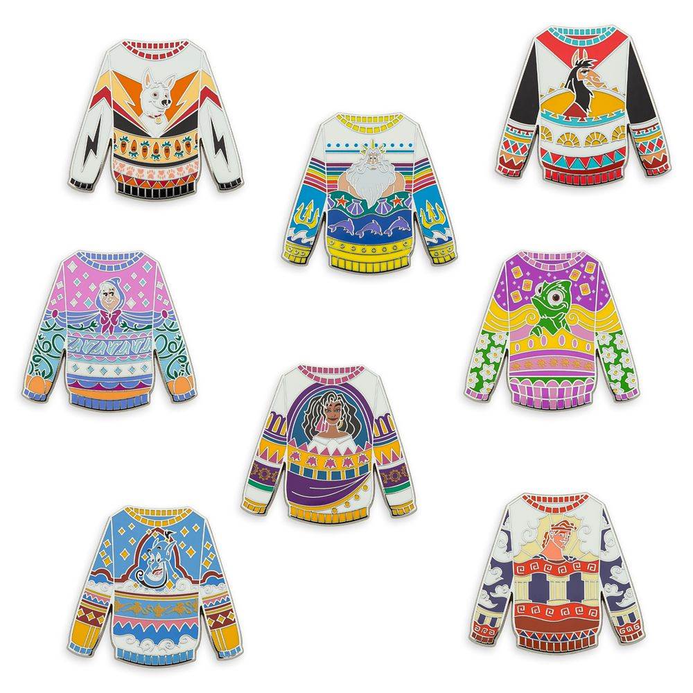 - Each box contains two randomly selected pins from eight overall designs in the series: Fairy Godmother (Cinderella), King Triton (The Little Mermaid), Genie (Aladdin), Esmeralda (The Hunchback of Notre Dame), Hercules (Hercules), Kuzco as Llama (The Emperor's New Groove), Pascal (Tangled) and Bolt (Bolt) as holiday sweaters