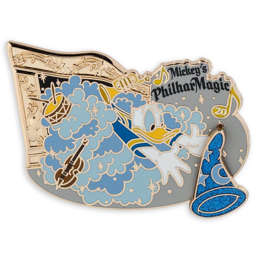 - Those fond of Mickey’s Philharmagic will love the new spinner pin that features Donald Duck flying back into the theater in a cloud of magic stardust. What’s he doing? Chasing after Mickey’s Sorcerer hat!