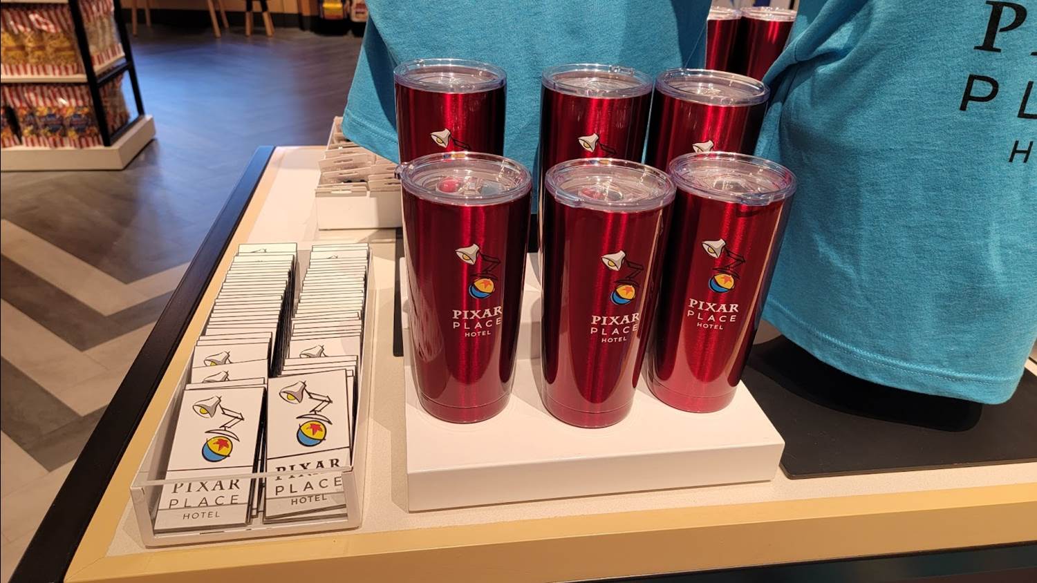Included in this small collection of new merchandise are a T-Shirt, a tumbler and a magnet – all featuring the hotel’s logo, Luxo Jr. and the Pixar ball.