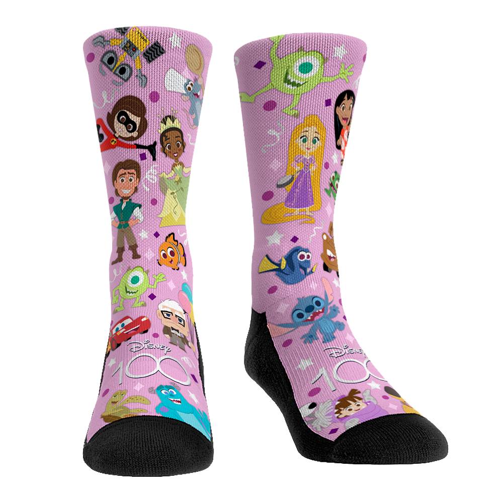 - Rock ‘Em’s signature black-soled socks get the party started with allover prints showcasing the popular icons of each era surrounding a large Disney100 on the top of the foot.