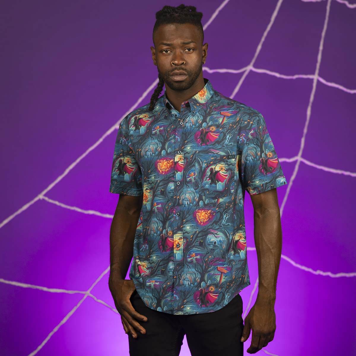 The Spooky Classics Collection is available now directly through RSVLTS. Kunuflex button downs ($70) both classic and ladies cuts along with crewneck tees ($32) are available in sizes XS-4XL for adults; Youth styles ($45) come in sizes XS-2XL, and preschool styles ($39) are sizes 2T-5T. Hats ($30-35) are one size.