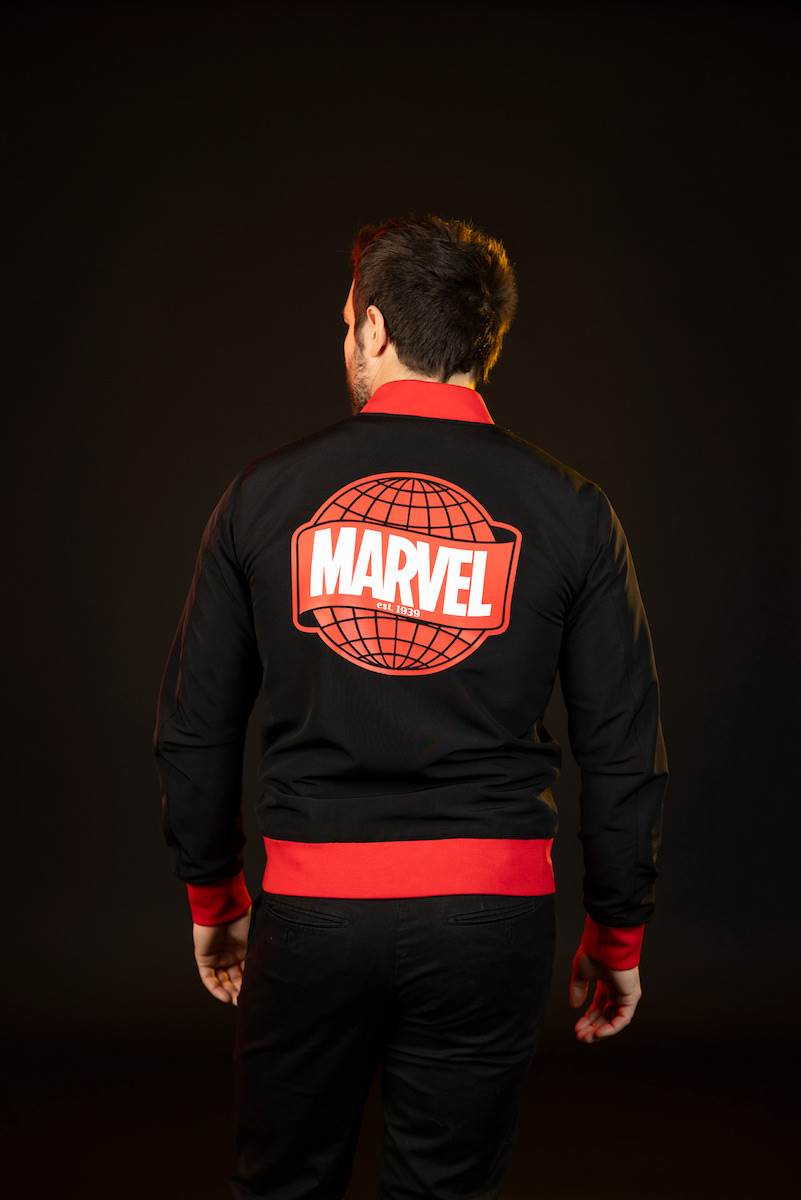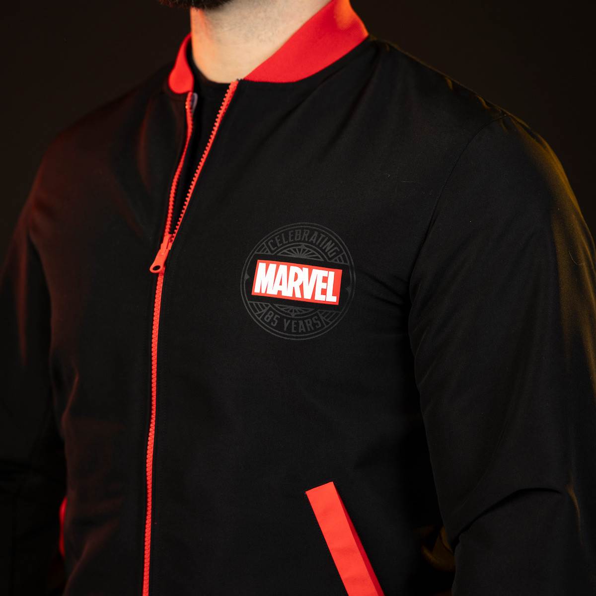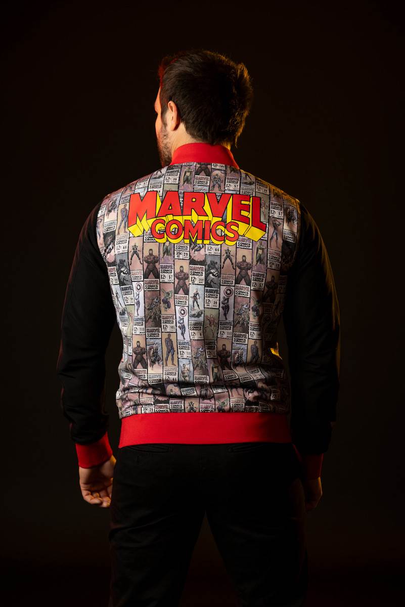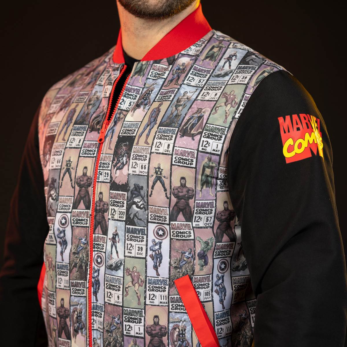 - Just like our favorite comic series, this bomber jacket is kinda a page turner…because it's reversible! Classic Marvel logos star on one side that’s all black with red trim, while the other gives us a muted version of Corner Box Brigade and red and yellow “Marvel Comics" logos.