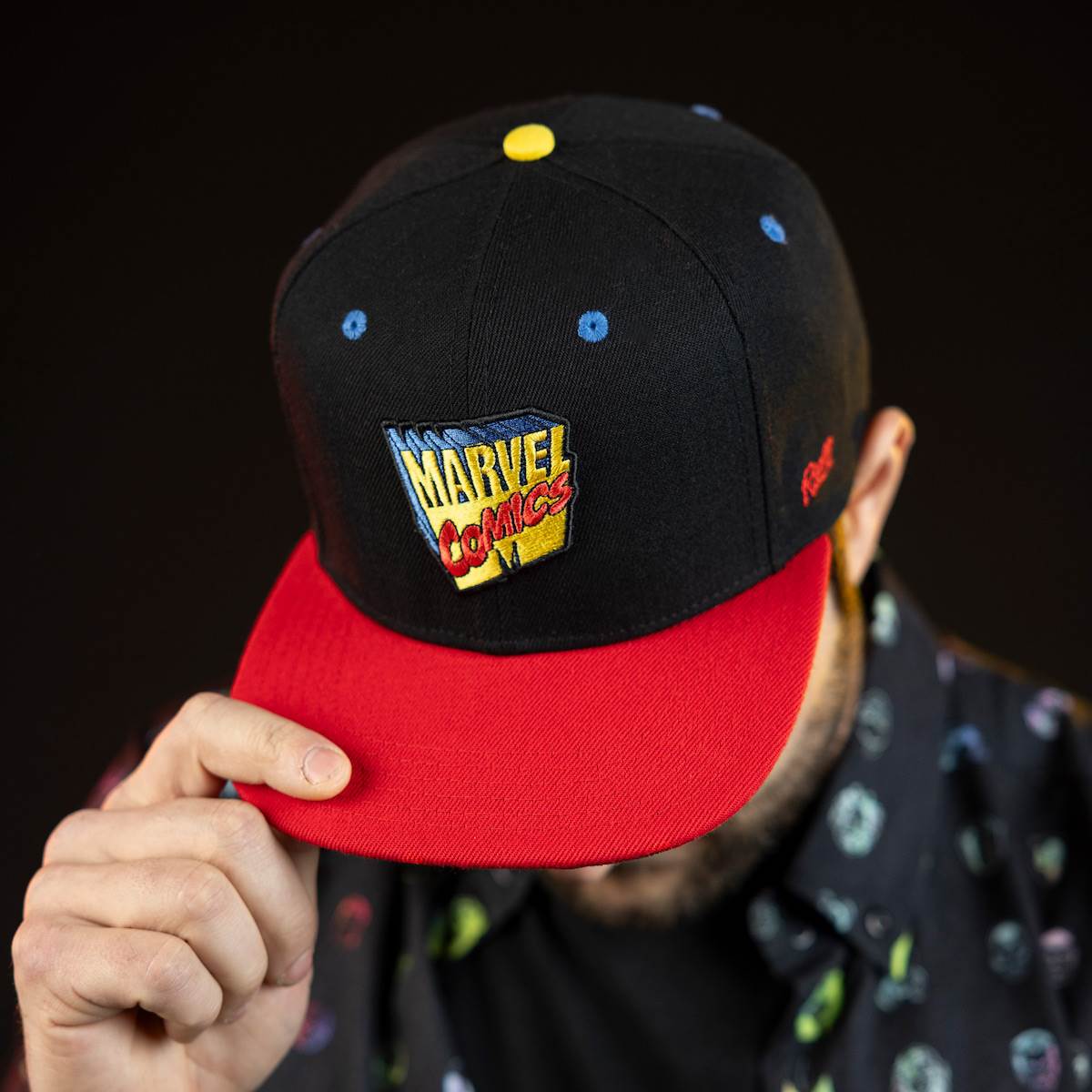 - Last but not least is the black and red “Marvel Comics" hat that features the classic logo on the front. A yellow button at the top compliments the look and blue eyelets around the crown add just a touch of additional color.