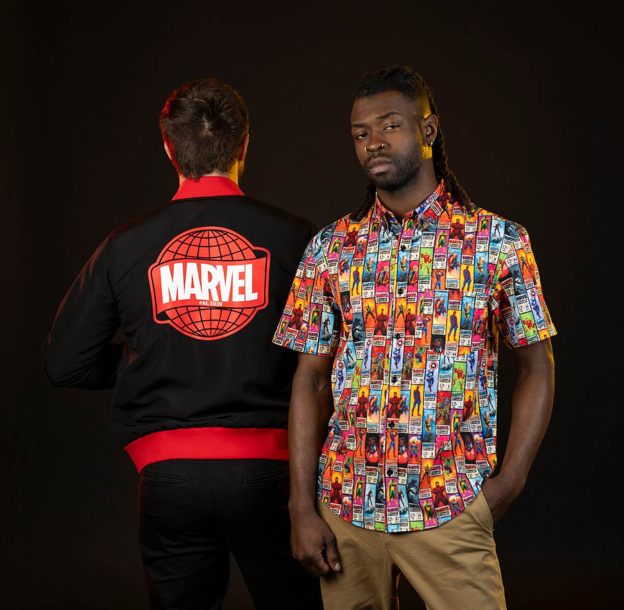 - Like any good comic book you’ve got to have a compelling image in the top left hand corner. RSVLTS honors the Marvel tradition with “Corner Box Brigade" (Ladies; youth) a super colorful button down featuring icons like Spider-Man, Namor, Iron Man and Captain America.