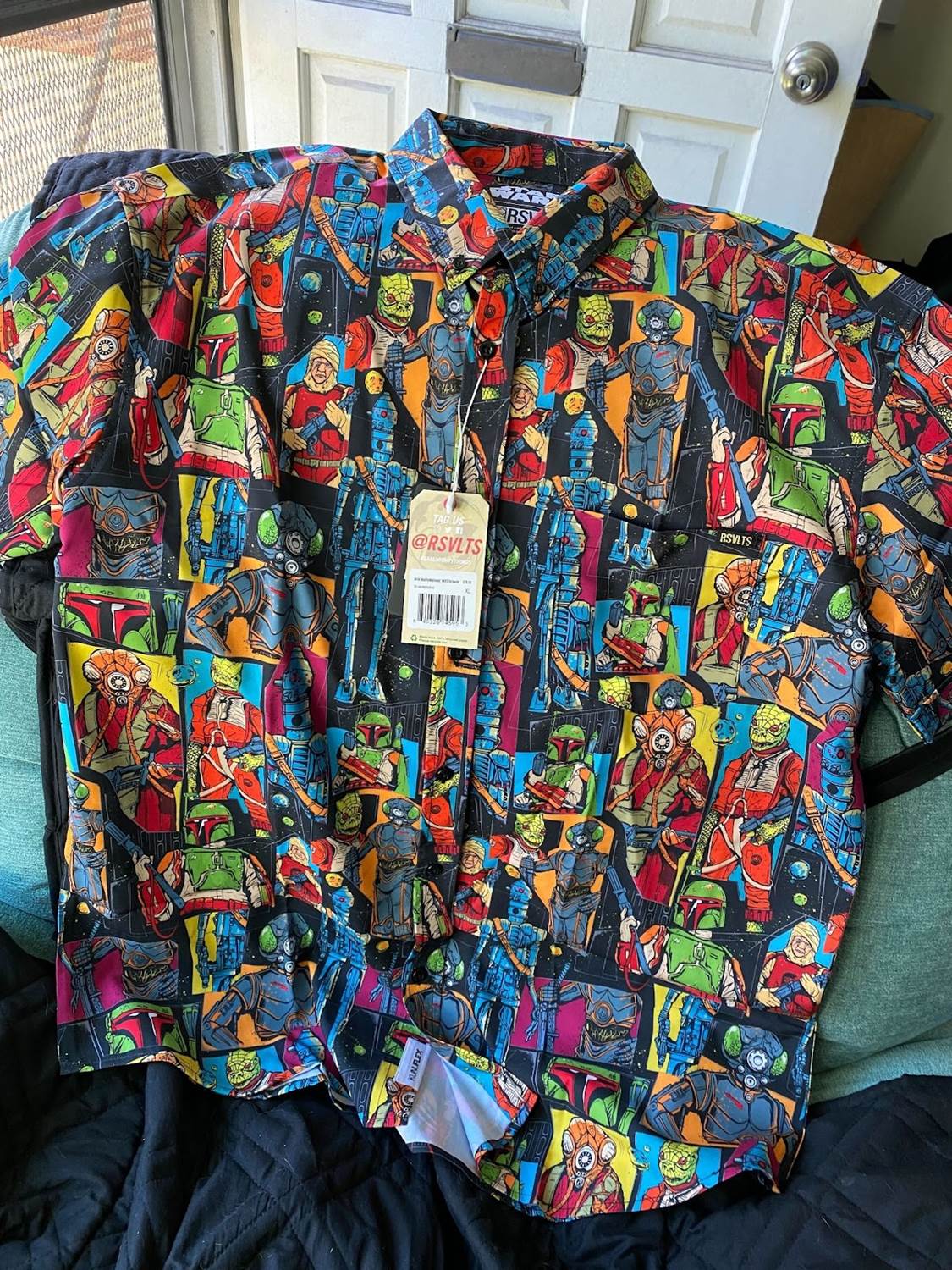 My favorite of the three items that were sent over by RSVLTS was immediately the Star Wars “Any Methods Necessary" KUNUFLEX Short Sleeve Shirt ($70), which I already love so much that I just had to take it with me to show off at WonderCon 2024 in Anaheim this past weekend. The colors on these bounty hunters really pop, and I got a lot of compliments on the shirt while walking around the convention floor. As an avowed fanatic of all of the six characters depicted in this pattern (and someone who named my Star Wars podcast “Who’s the Bossk?") it’s hard to feel like this item was not ready-made for me. I genuinely can’t wait to wear it to future events.