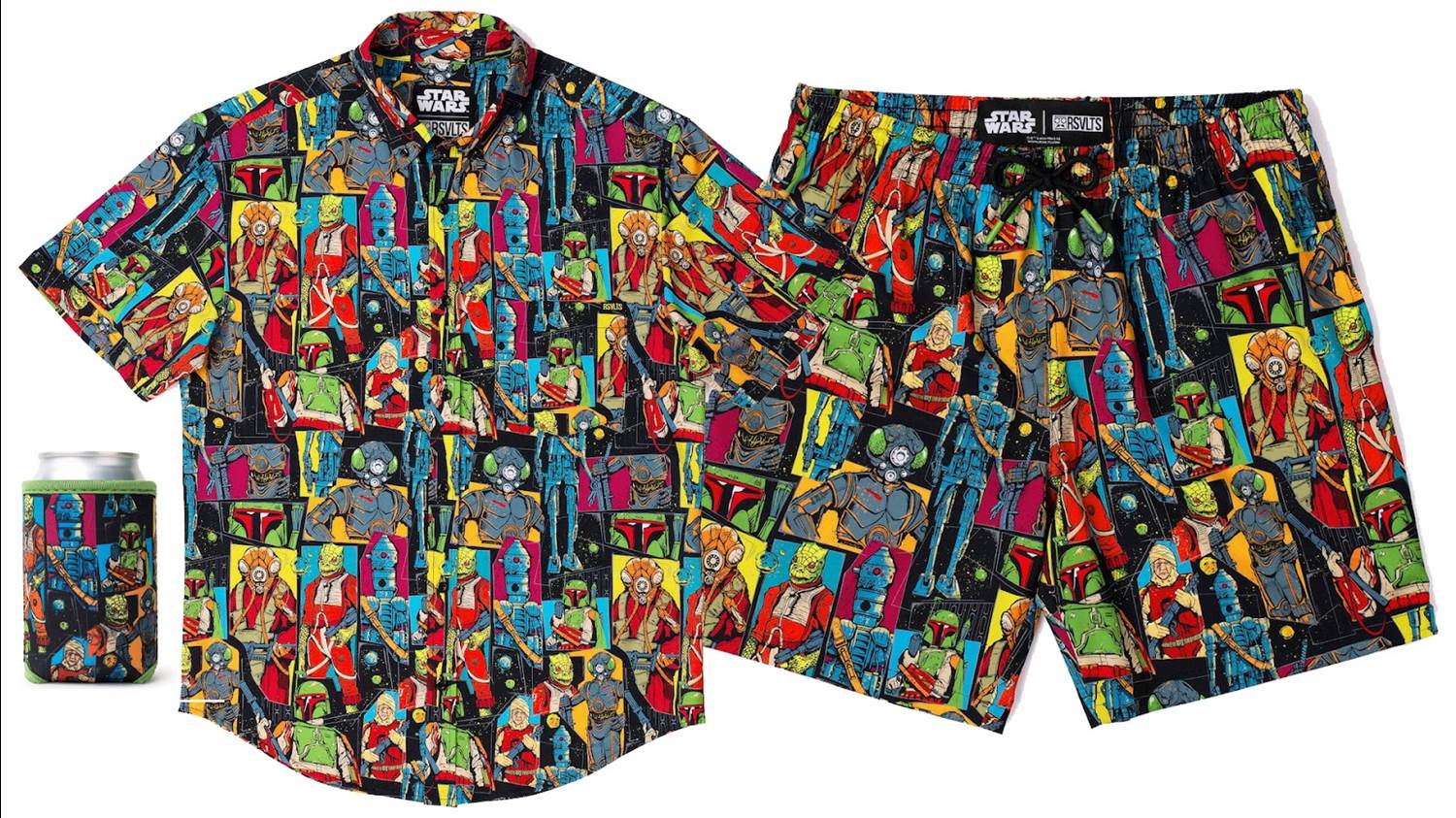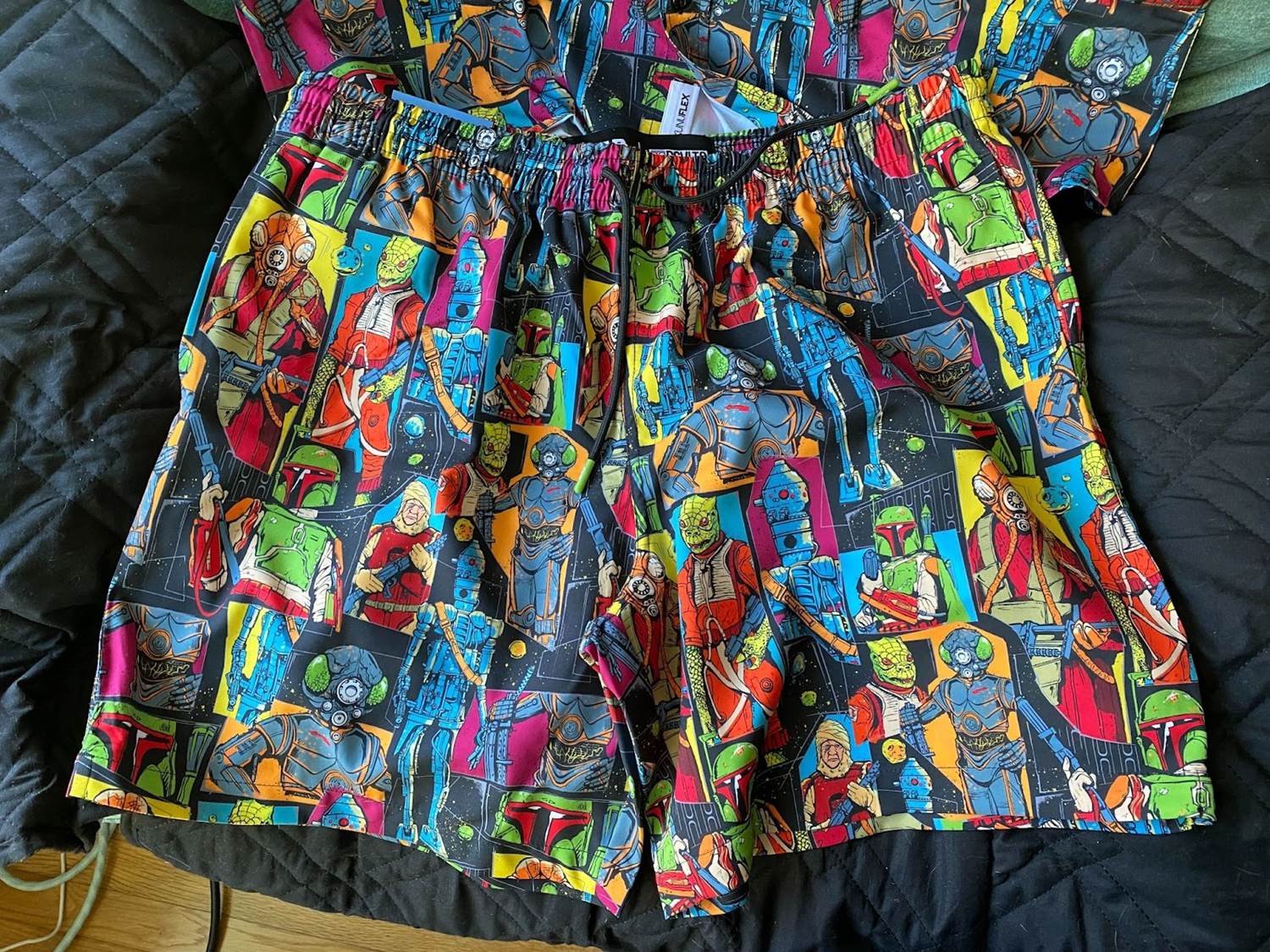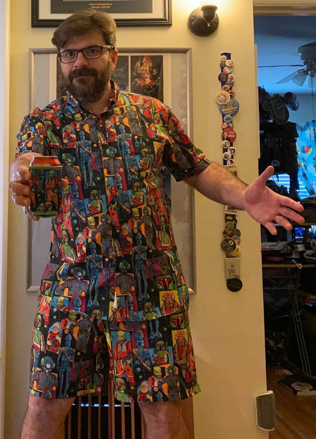 And lastly (but perhaps not leastly, depending on your own tastes), I also received the Star Wars “Any Methods Necessary" Hybrid Shorts ($65), which perfectly match the bounty hunter pattern on the other two items. They’re made of quite comfortable fabric, and I can definitely see myself lounging around in them or even going swimming with them on, as that’s apparently what “hybrid" means in this instance. The other option is to buy both the short-sleeve shirt and the shorts and wear them together, which I’m told is rather ironically called a “tuxedo" look. That’s not a style I would ordinarily wear, but I had to try it at least once (with Kunu Kooler in hand, of course) for the photo below, which was definitely intentionally shot in as low light as possible.