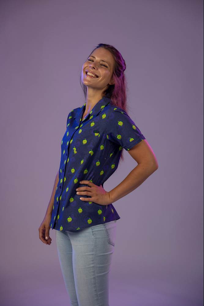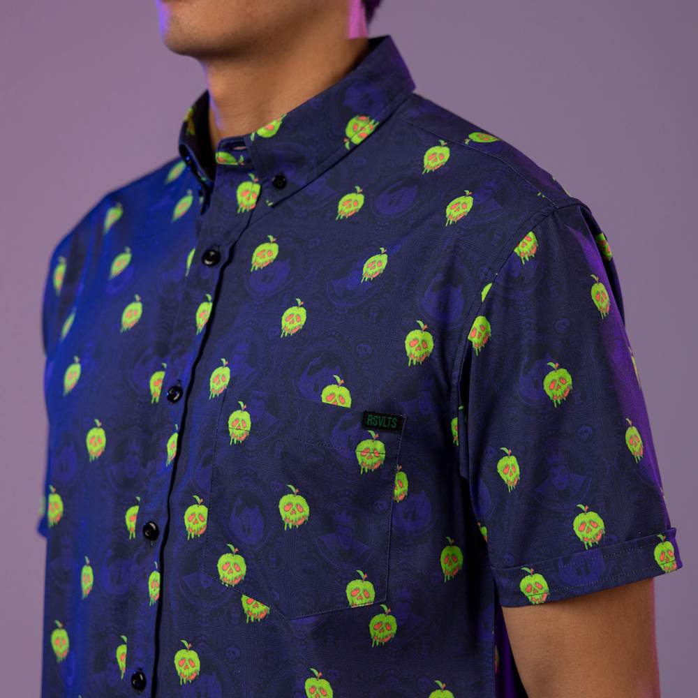 - For a neon look that’s sure to grab everyone’s attention, “Bad Apples," is the way to go. This deeply saturated blue-purple shirt features more than a bushel’s worth of poison apples decorating the foreground while subtle images of the Queen and her alter ego the Old Hag can be spotted the magic mirror background.