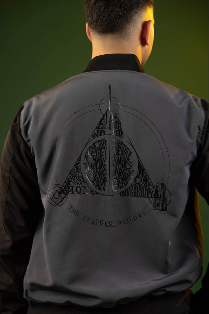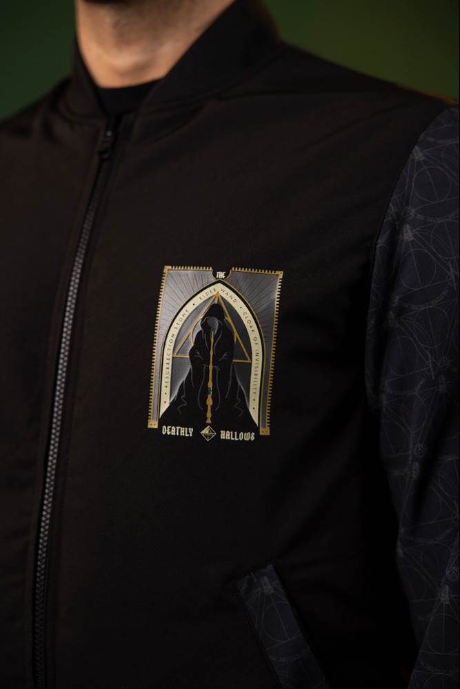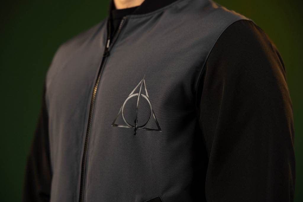 - Finally we come to the pièce de résistance: a reversible bomber jacket titled “Deathly Hallows." Shades of black and grey persist on this classy wardrobe essential where one side features a small Deathly Hallows symbol on the chest and a large version on the back made up of the word describing the power of each element.