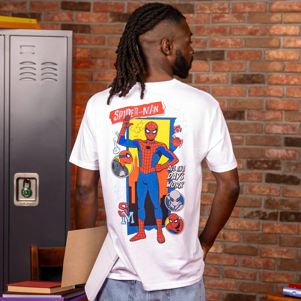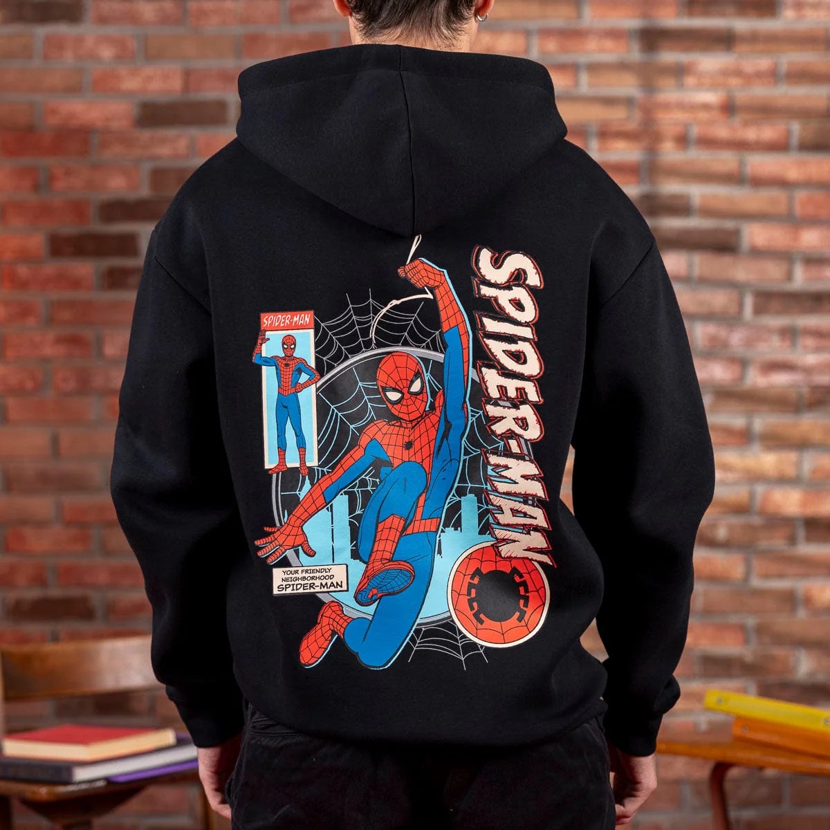 Fans can also celebrate everyone’s favorite webslinger with the “Hey, Neighbor!" classic hoodie and the “All in a Day’s Work" crewneck tee.