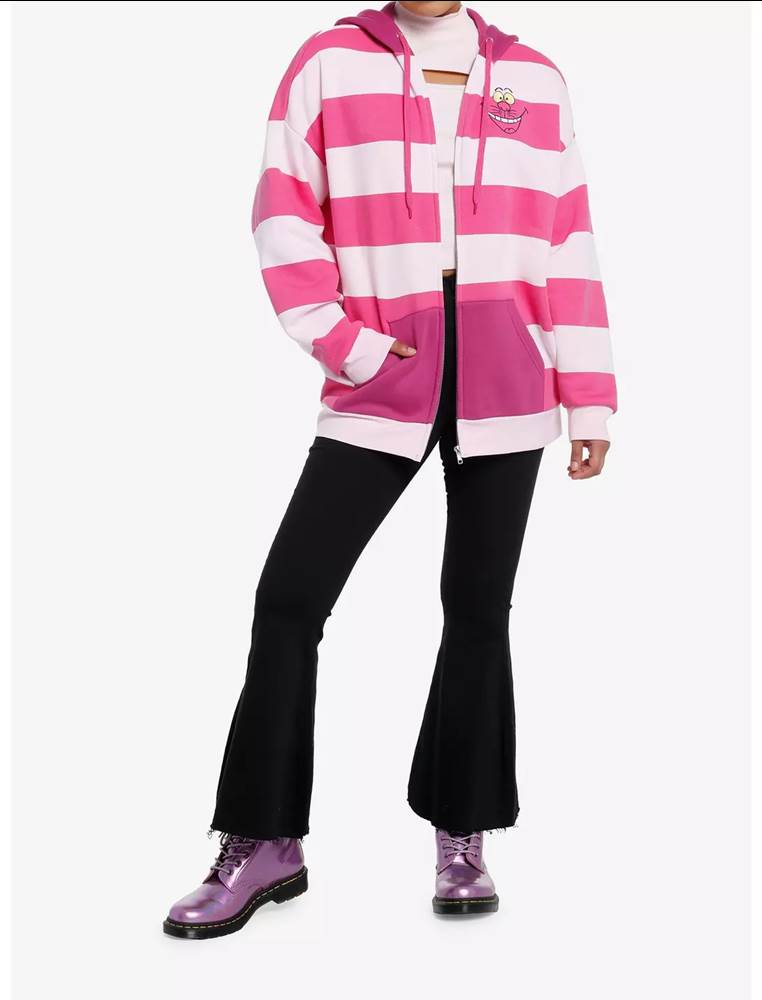 The cheshire cat’s signature pink stripes are boldly expressed in a Hot Topic hoodie. Large lettering declares “We’re all mad here" across the back along with a cat tail hanging down while the cat’s grinning face is all that remains on the front chest pocket.