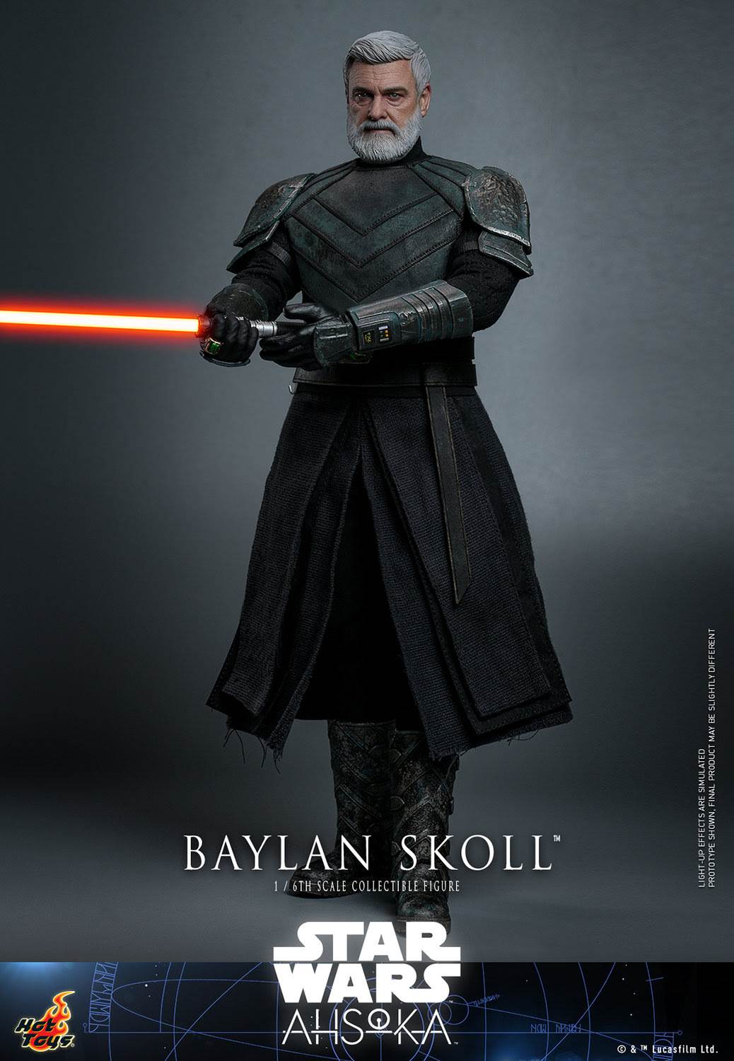 - Sideshow: “Don't miss this Hot Toys Ahsoka Baylan Skoll figure unboxing in this episode of Sideshow First Look! Sideshow and Hot Toys are delighted to introduce the highly-anticipated Baylan Skoll Sixth Scale Figure inspired by Star Wars: Ahsoka. The Star Wars collectible figure features a newly developed head sculpt with separate rolling eyeballs to adjust the eyesight, a meticulously crafted outfit and cloak, a form-fitting under-suit, an LED light-up lightsaber, interchangeable lightsaber blades emulating the weapon in motion, and a display base."