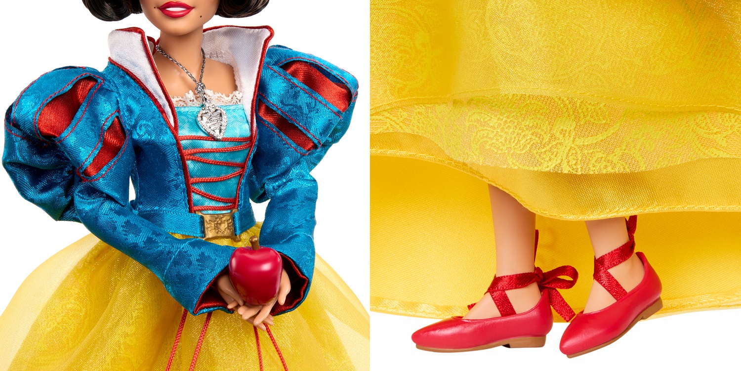 - The Snow White doll wears a detailed blue and yellow puff-sleeved gown with a three-layered yellow satin and organza skirt, a bright red hooded cape, a matching bow headband and crimson shoes. The Disney princess comes with two bluebirds, a glossy red apple and a silver heart pendant necklace.
