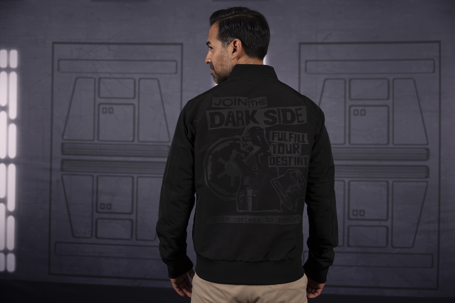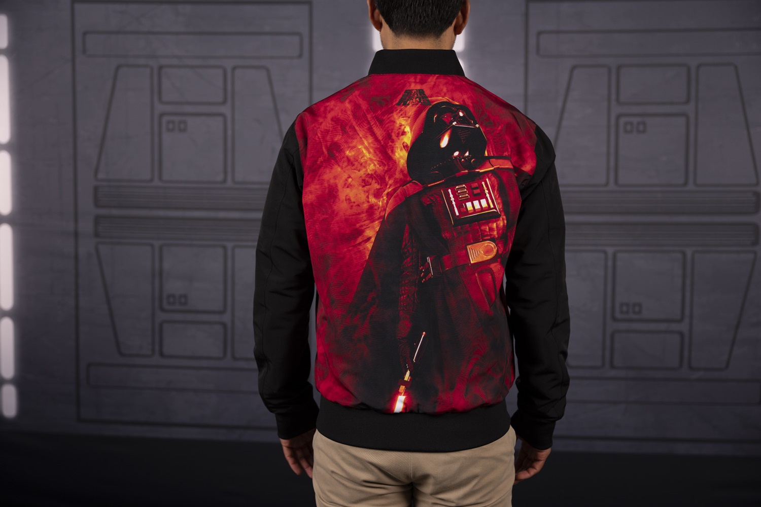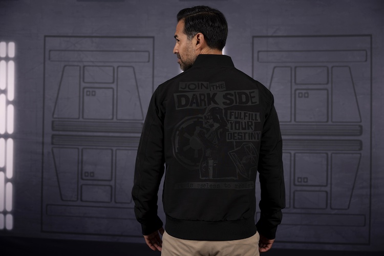Fans will also love the classic crewneck sweatshirt sporting the Rebel logo, and the “Rebel Scum" cotton hoodie (toasty warm, just not s t r e t c h y) decorated with Luke’s Red 5 helmet. Going bold and dark at the same time with Dark Side reversible bomber jacket that has a fiery Darth Vader on one side and “propaganda" style poster featuring the baddie daddy.