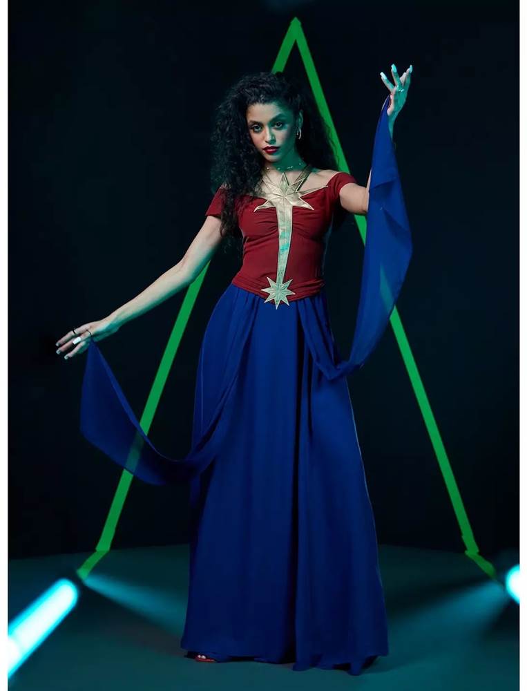 You definitely make a super statement everywhere you go when dressed in Captain Marvel fashion from Her Universe. This gorgeous maxi dress is inspired by Captain Marvel's floor-length gown from the film and features dramatic cold shoulders and embroidered signature star symbol.