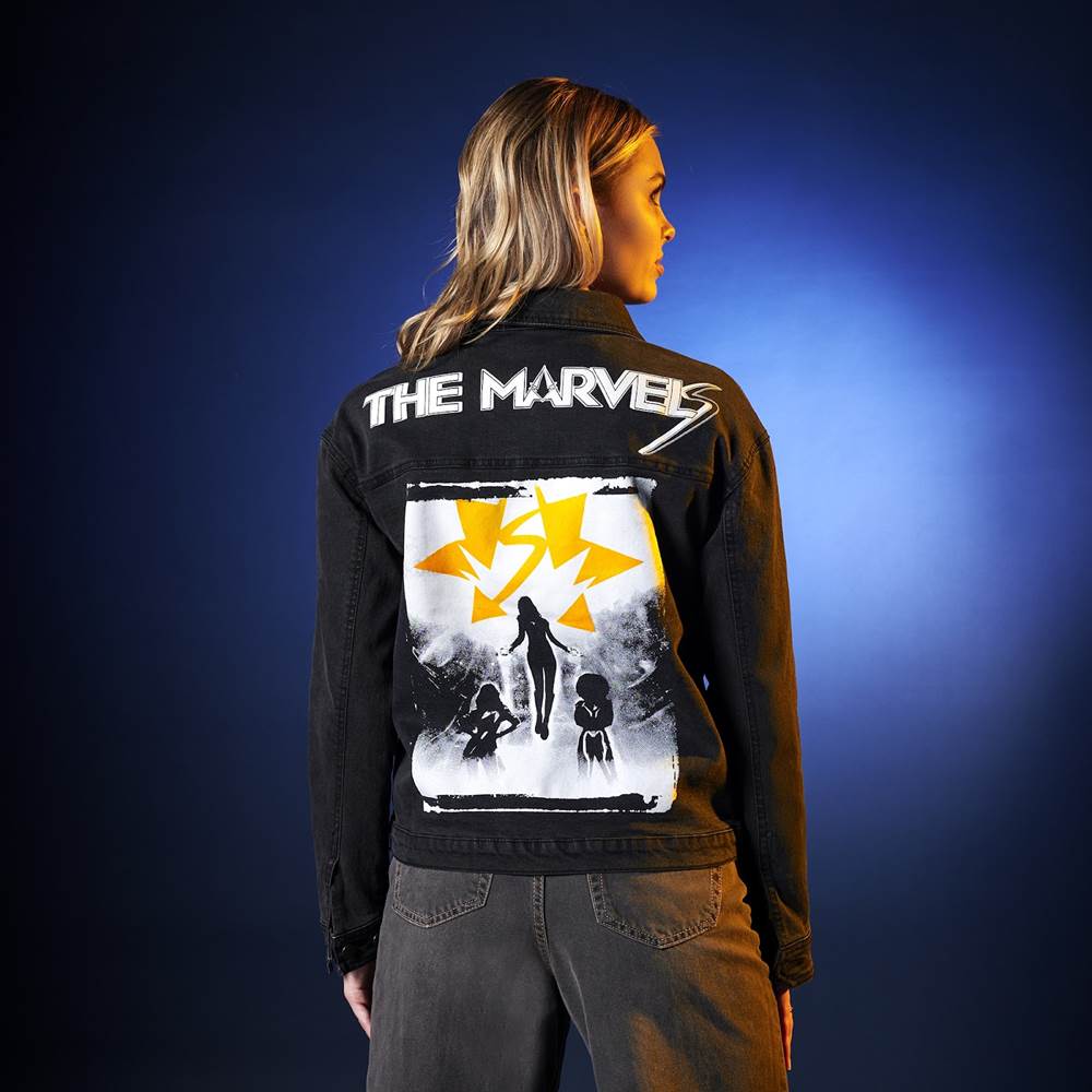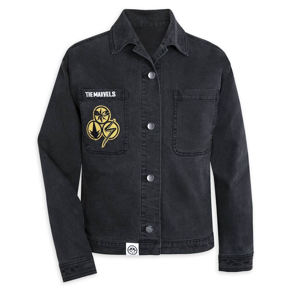 Continuing with the theme of “team" shopDisney delivers a fun assortment of apparel like this dramatic black denim jacket that spotlights Captain Marvel, Ms. Marvel and Photon. The ladies are silhouetted on the dynamic screen art on the back, along with the film's title. A peek at the front show a trio of symbols embroidered on the chest pocket below the title.