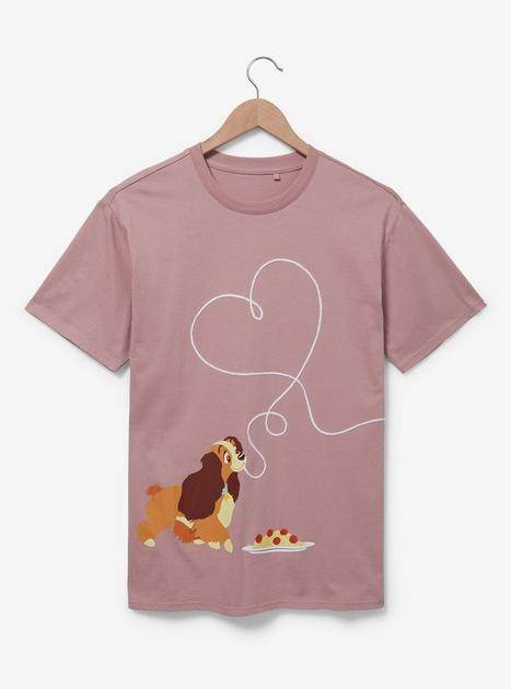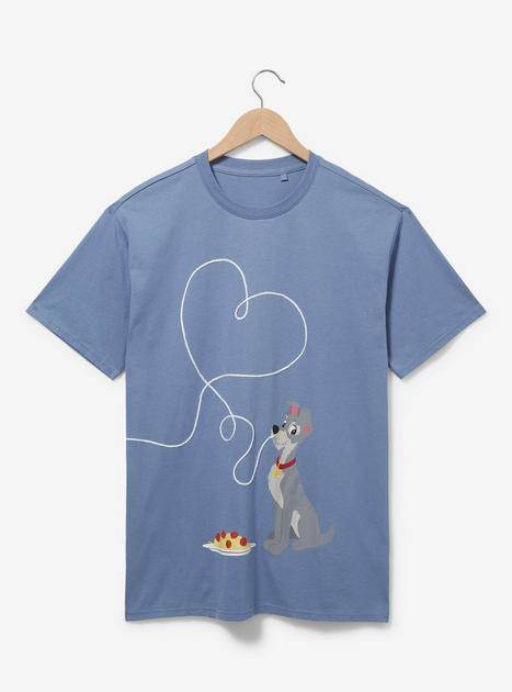 If your goal this V-Day is to replicate the Spaghetti scene from Lady and the Tramp, you can go so far as dressing in matching shirts for the occasion! Lady graces a rose colored T-shirt and is chowing down on some spaghetti. The great big noodle rises above her forming a heart that reaches over to…form another noodle heart on a blue shirt where Tramp is enjoying his spaghetti!