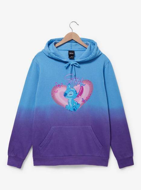 How fun are these split dye hoodies featuring Angel and Stitch?! Originally known as Experiments 624 and 626 respectively, the cute troublemakers are in a zen mood right now as they gaze in the other’s direction. Angel’s hoodie is peach and burgundy while Stitch and his big heart are positioned against two shades of blue.