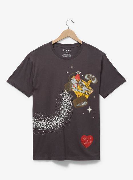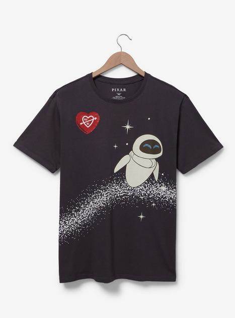 Pixar’s WALL•E and EVE have a love that’s out of this world! The robot couple float in the air on separate shirts as a trail of fire extinguisher dusts swirls below them. EVE floats towards the left part of her shirt looking in WALL•E’s direction. He is backed up against the left side of his shirt as the fire extinguisher pushes him through space!