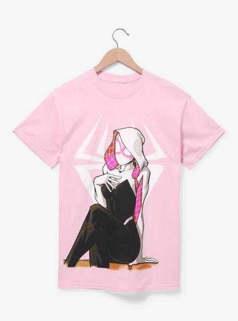 Swinging over to the Marvel universe and the Spider-Verse at that, it turns out that heroes Miles Morales and Spider-Gwen kinda, sorta have a thing for each other! Miles sits in front of his signature spider logo and holds out a pink rose for Gwen; meanwhile she too is in front of her logo while holding her hand up to her chest as if to say “For Me?"