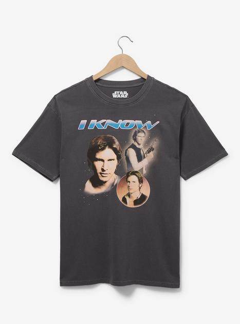 Fans of all things Star Wars can pick up the Princess Leia “I Love You" and Han Solo “I Know" tees that feature those famous lines of dialogue along with three images of each from A New Hope and The Empire Strikes Back.