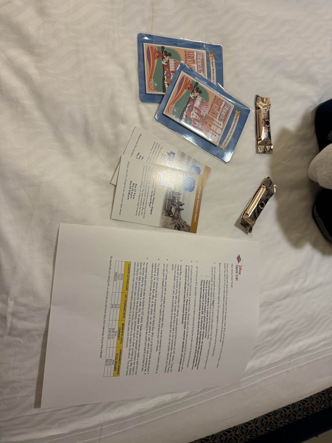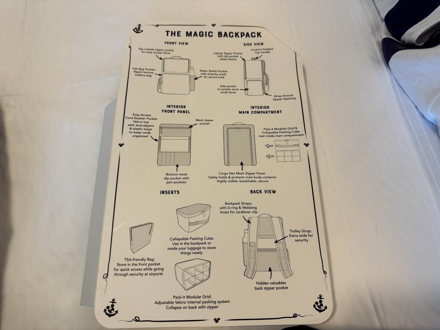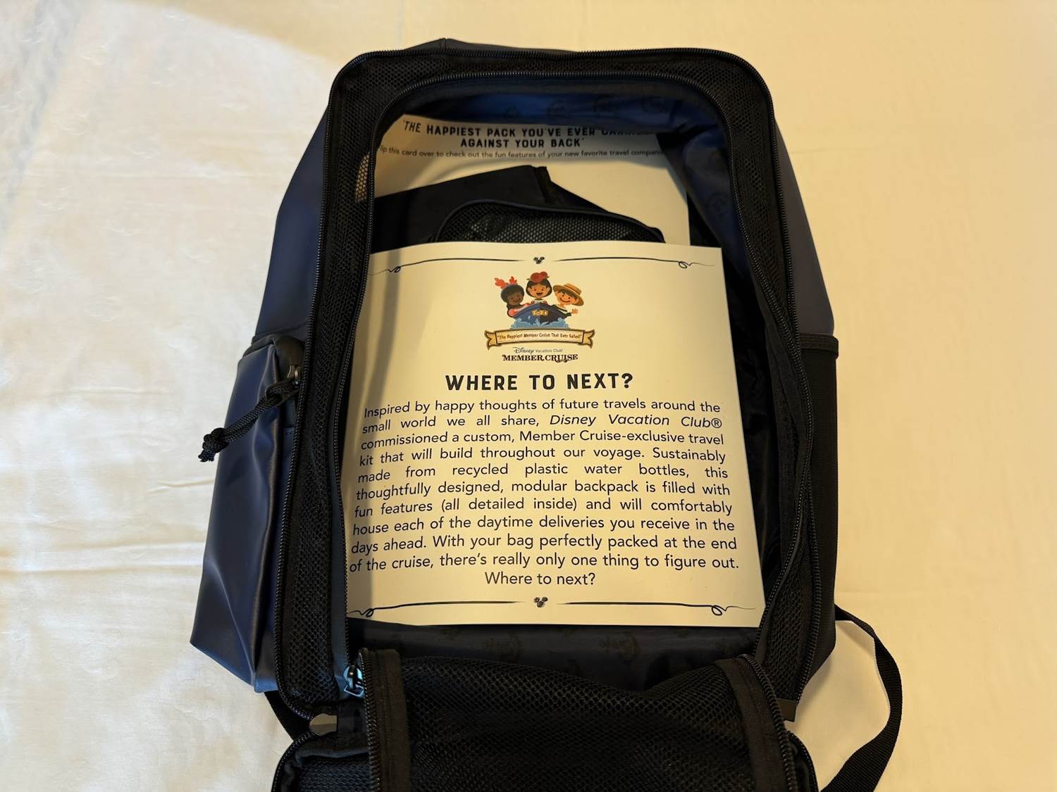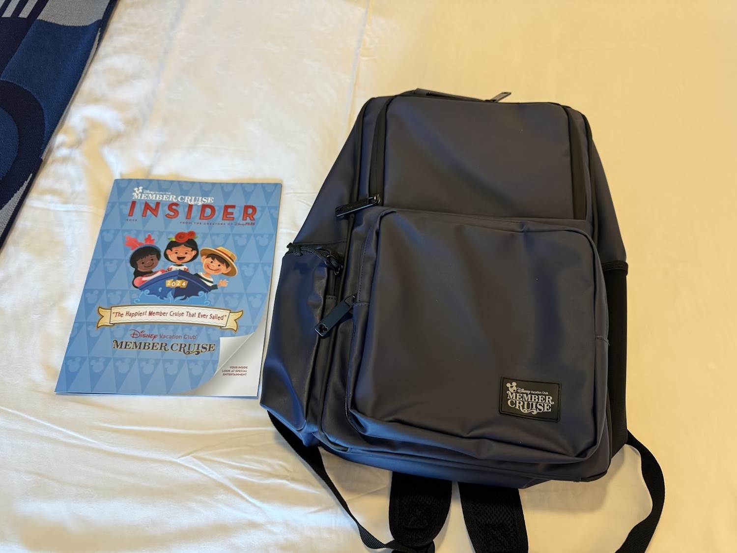 A Disney Vacation Club Member Cruise is a very special experience, some comparing it to a D23 event with its special entertainment and panels, not to mention the amount of swag those aboard the ship receive. On Day 1, those aboard the ship received a very inventive backpack, and some fun items denoting the embarkation port of call aboard this voyage - Barcelona, Spain.