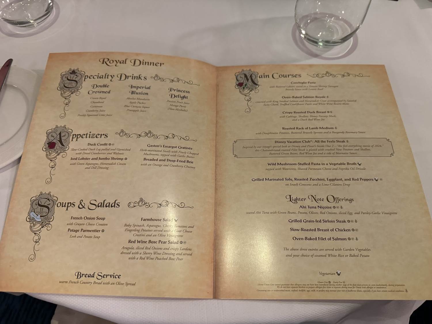At the Royal Palace restaurant aboard the Disney Dream, passengers on the Member Cruise voyage can also order an Inside Out 2 themed dinner entree!