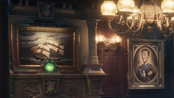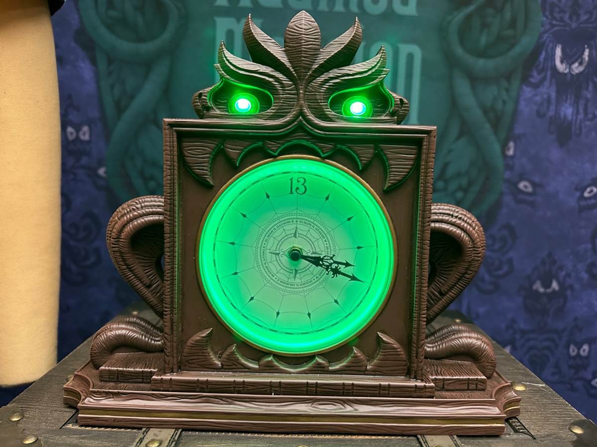 Looking at the concept art up close, you just start to see things that are picked up from visits to the Haunted Mansion. But hearing about how, when you open the door into the parlor, it will be the snake door handle or how the light fixtures on the wall will be a version of the bat stanchion from the queue, my mind just started to race. Of course, it wouldn’t be new WDI project without some Easter Eggs — and while they wouldn’t go into much detail, they did share the clock face (a version will be available to purchase on the ship) on a shrunk down version of the Grandfather Clock in the corridor of doors does have some interesting coordinates if you look close enough.