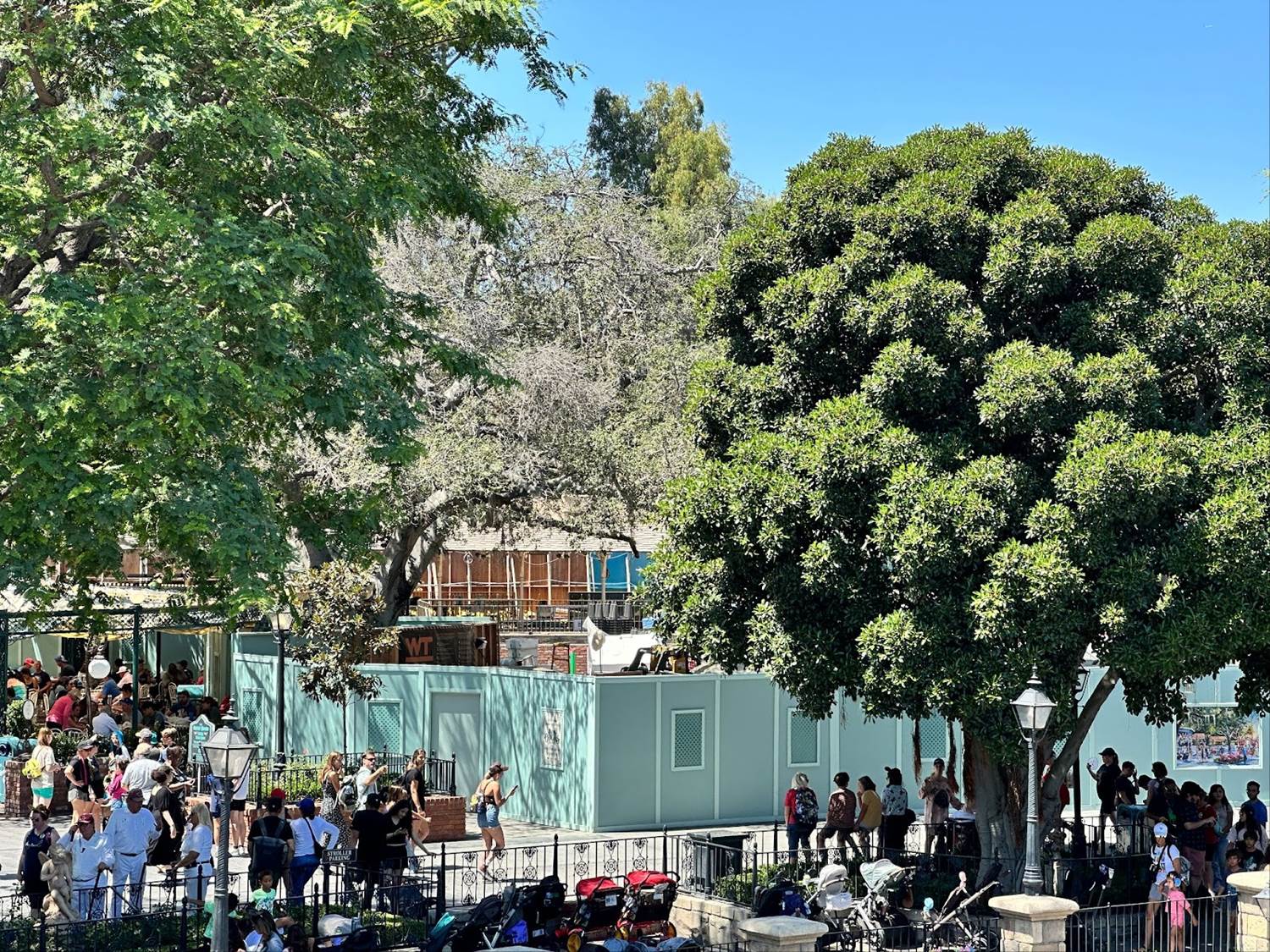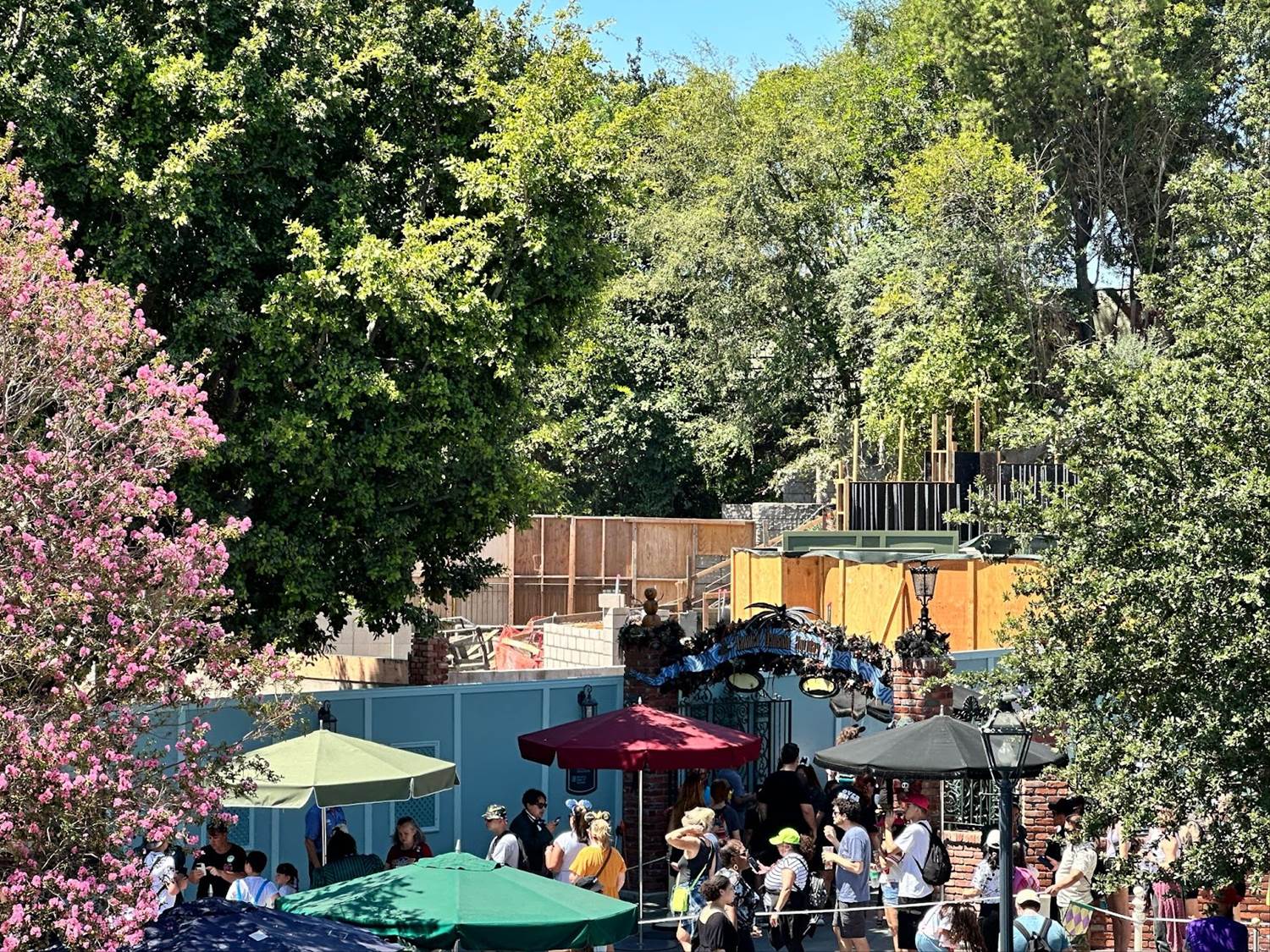 The updated queue is promised to be more immersive and much larger than before. The ultra popular attraction almost always had an extended queue into the old fountain courtyard in front of the New Orleans Square Disneyland Railroad station. Additionally, Disney is adding a new retail space right outside of the attraction’s exit. Fans will be able to pick up Haunted Mansion themed souvenirs once it opens. Right now, construction of the new facility is hard to capture, but you can catch a glimpse of the concrete structure rising behind the trees.