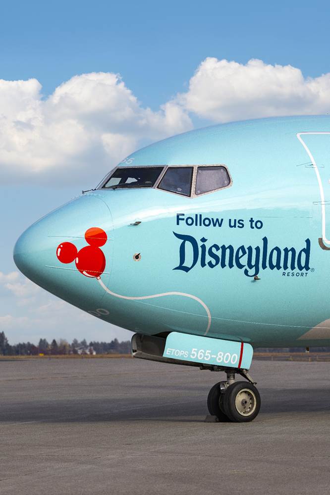 - After the big reveal of this specially themed plane at a gate ceremony in Seattle, passengers will board the inaugural flight to Orange County, Calif., to visit “The Happiest Place on Earth" at Disneyland Resort in Anaheim.