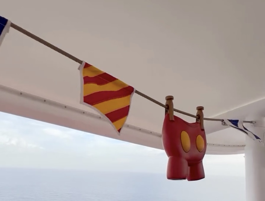 - First, the flags featured in the queue, surrounding a pair of Mickey’s shorts, spell out none other than Mickey’s name.