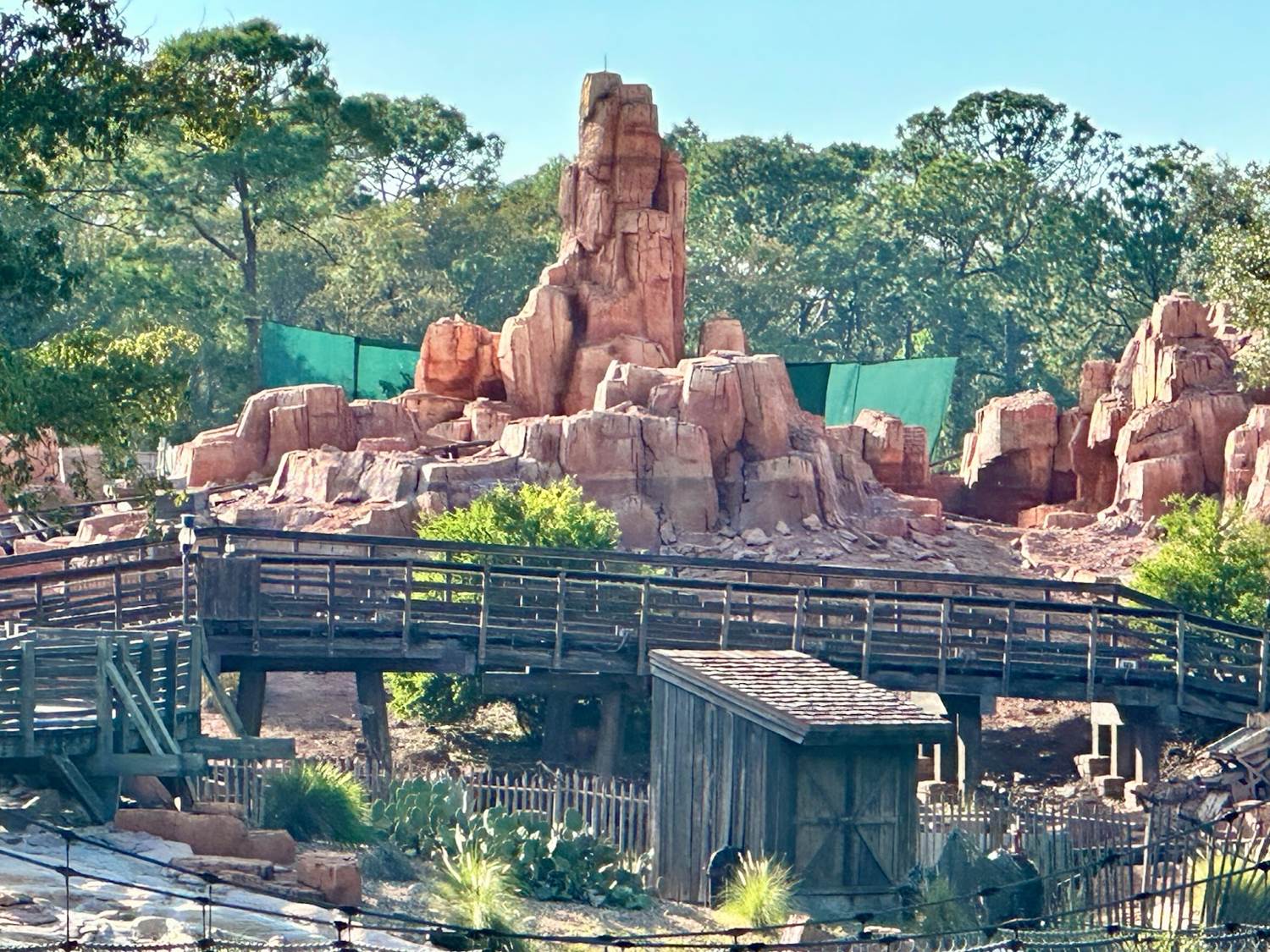 - A giant green scrim has appeared behind the towering mountainous structure of Big Thunder Mountain as preparation work for the attraction’s massive refurbishment begins.