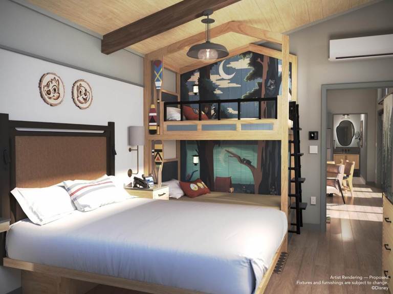 The Cabins at Disney’s Fort Wilderness Resort are not only fresh and modern, they pay tribute to classic Disney Characters as well as the rich history of Disney’s Fort WIlderness itself. Throughout the cabins, Chip & Dale are featured as unofficial mascots of the new cabins. They are featured above the bed in the main bedroom, and acorns adorn throw pillows and other features in the cabins themselves.
