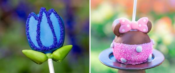 - Pink Minnie Caramel Apple: Granny Smith apple dipped in caramel, enrobed in milk chocolate, adorned with marshmallow ears, and dressed with pink sanding sugar and white M&M’S Milk Chocolate Candies
